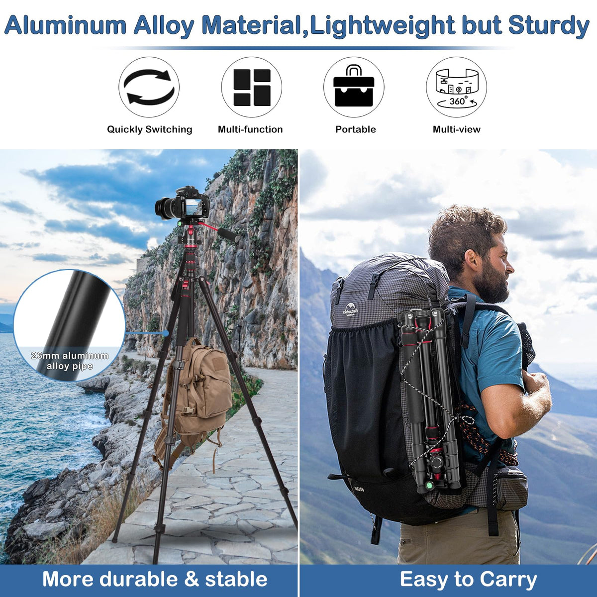Nietoto Camera Tripod For Camera - 68'' Lightweight Camera Video Tripod, 360 Ball Head Tripod With Removable Handle, Tall Travel Tripod For Photography, Extra 1/4'' Qr Plate And Phone Holder,Compatible With Canon Nikon Sony.