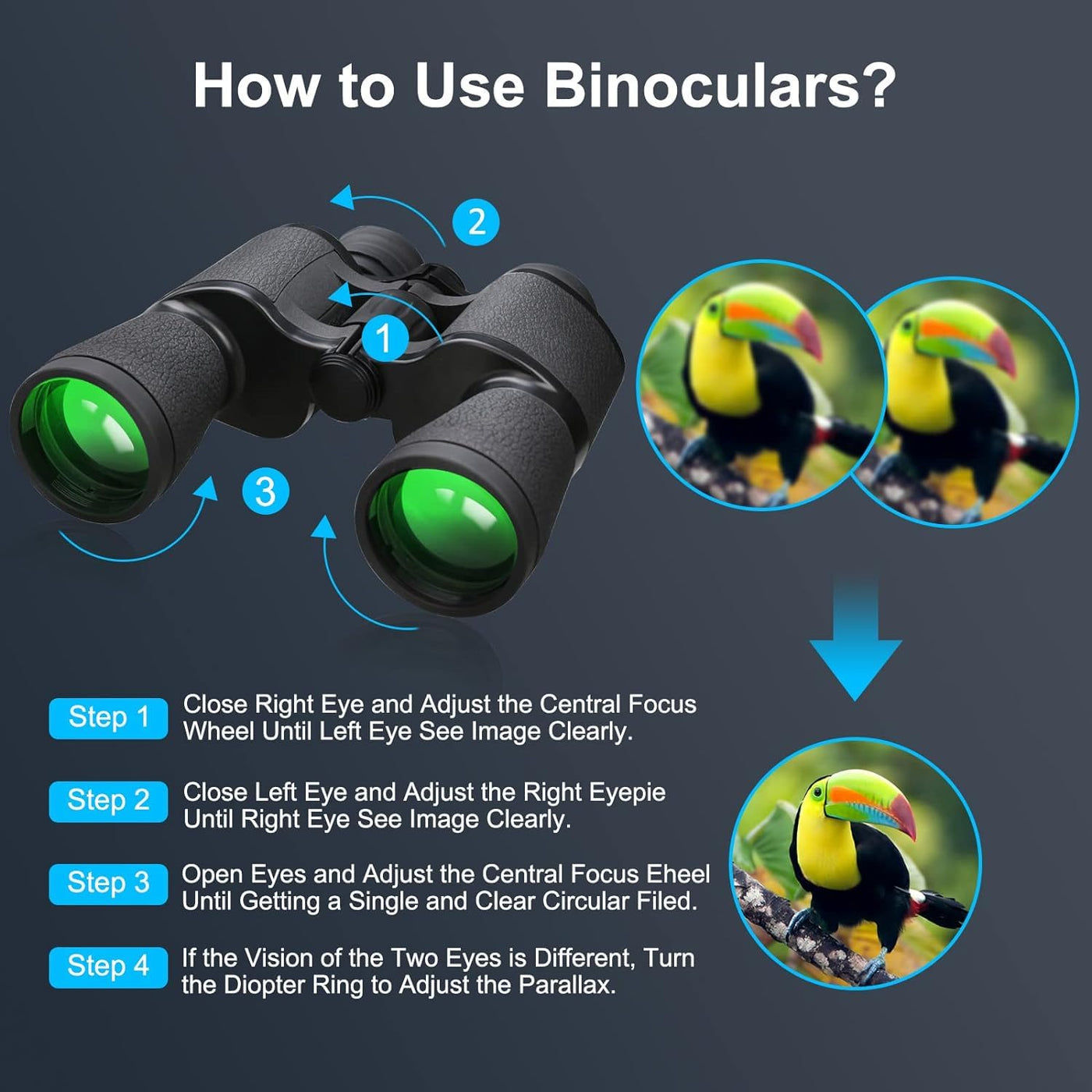 ?Professional 20X50 High Powerful Hd Binoculars? Experience The World Through New Eyes With High Powerful Binoculars For Adults. Premium Optics Unlock A World Of Vivid Details In Stunning High Definition. Fully Multi-Coated Lenses And Bak-4 Prisms Ensure The Brightest, Truest Views Whether At Dawn, Dusk Or Nightfall. An Expansive Field Of View Makes It Easy To Track Birds In Flight Or Spot Distant Subjects. Built For Hiking Binoculars. | ?Easy To Focus& Glasses Wearer Friendly? These Bird Watching Binoculars Are So Easy To Use! You Can Quickly Focus In Just 3 Steps. First Adjust The Width To Fit Your Pupil Spacing, Then Rotate The Smooth Center Focus Wheel And Right Eyepiece To Focus. If You Wear Glasses, You Can Easily Adapt The Light Binoculars By Pulling Off The Rubber Eyepiece And Getting Closer To The Lens For A Better View. Or If You Need More Stability, It'S Perfectly Fine To Use It With A Tripod. | ?Durable&Waterproof&Fog-Proof? These Binoculars For Hunting Not Only Do They Provide Excellent Grip And Shock Resistance With Their Non-Slip Armor Surfaces, But They Also Have O-Ring Sealed Optics With A Fog-Proof Coating To Keep Moisture, Dust And Debris Out Of The Travel Binoculars For Adults. Plus, They Are Waterproof, Making Them Perfect For Outdoor Activities. It'S The Best Night Vision Binoculars For Hunting. | ?Application&Best Binoculars For Men? Fullja Bird Watching Binoculars For Adults Make An Effort To Offer You A Great Experience In Bird Watching, Hunting, Hiking, Cruising, Travelling, Watching Sports Events, Etc. They Make The Perfect Gift For Any Occasion! Whether It'S Father'S Day, Children'S Day, Christmas, Halloween, Or A Birthday, These Binoculars For Hunting Are Ideal For Boys, Girls, Kids, Teens, Adults, Friends And Family. Get Ready For A Memorable Experience! | ?One Year Warranty? You Will Get 1* Waterproof Binoculars, 1* Carrying Bag, 1* Neck Strap, 1* Manual, 1* Cleaning Clothes. Fullja Is 100% Responsible For The Product And Offers A 30-Day Full Money Back And 1-Year Warranty. Our Professional Service Team Will Provide You The Best Possible Service Within 24 Hours.