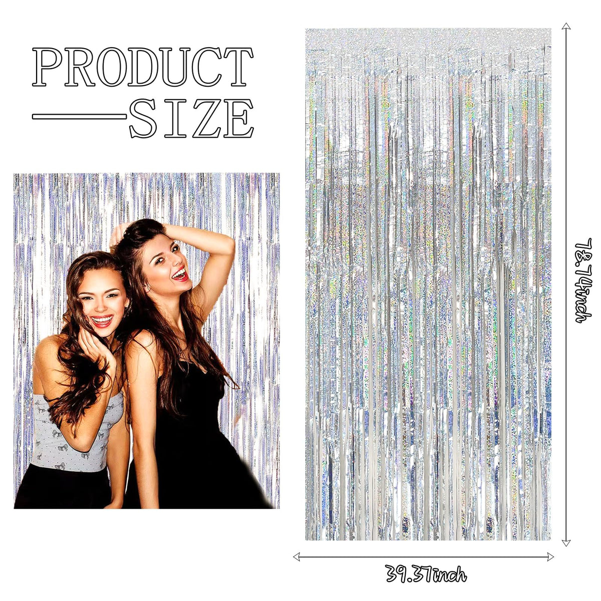 Q: What are the dimensions of the silver backdrop curtain?A: The silver foil fringe backdrop curtain measures 3.28 ft in width and 6.56 ft in height, making it suitable for various event decorations.