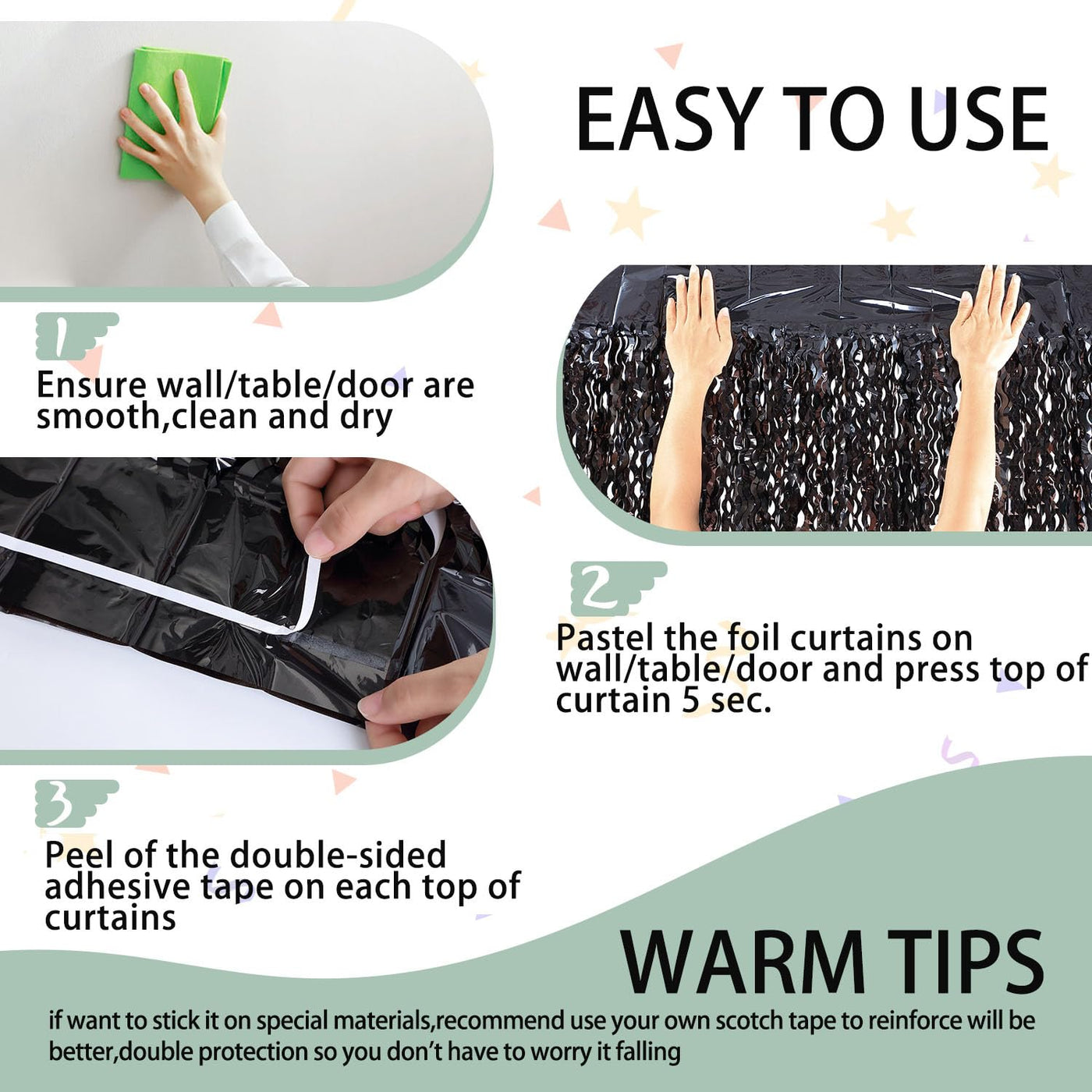 This 3-Pack Of Wavy Black Tinsel Foil Fringe Curtains Is Perfect For Adding A Touch Of Glamour To Your Parties And Events. Each Curtain Measures 3.3 X 6.6 Ft, Making Them Long Enough To Fit Any Occasion. The Curtains Are Made Of Aluminium Foil, Designed To Be Lightweight And Resistant To Wear And Tear. The Wavy Shape And Smooth Metallic Surface Of The Curtains Offer A Full Texture That Is Appealing To The Eye, Helping To Enhance Your Party Atmosphere And Add Color To Your Events. These Black Foil Curtains Are Suitable For A Wide Range Of Occasions, Including Halloween, Christmas, Anniversaries, Graduations, And More. They Can Also Be Used As Personalized Photo Booth Backdrops, Ceremony, Bar, Stage Background, Disco Decorations, And More. Please Note That The Curtains Should Be Hand-Washed Only Or Delicately Cleaned. The Care Instructions And Material Type Are Also Included In The Product Information.