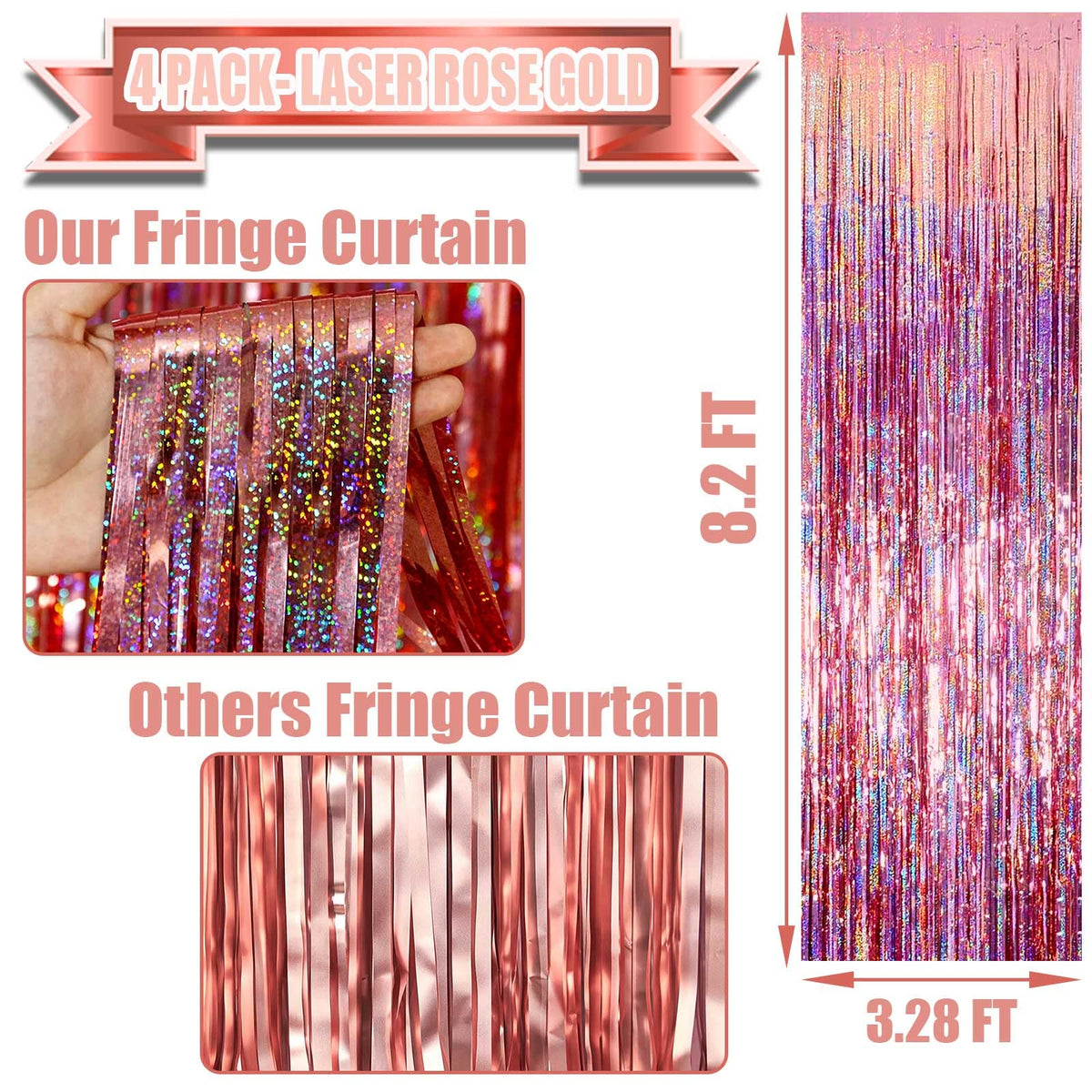 4 Pack Rose Gold Tinsel Foil Fringe Curtain Backdrop, 3.28Ft X 8.2Ft Metallic Streamers For Photo Booth Wedding Bridal Shower Ba