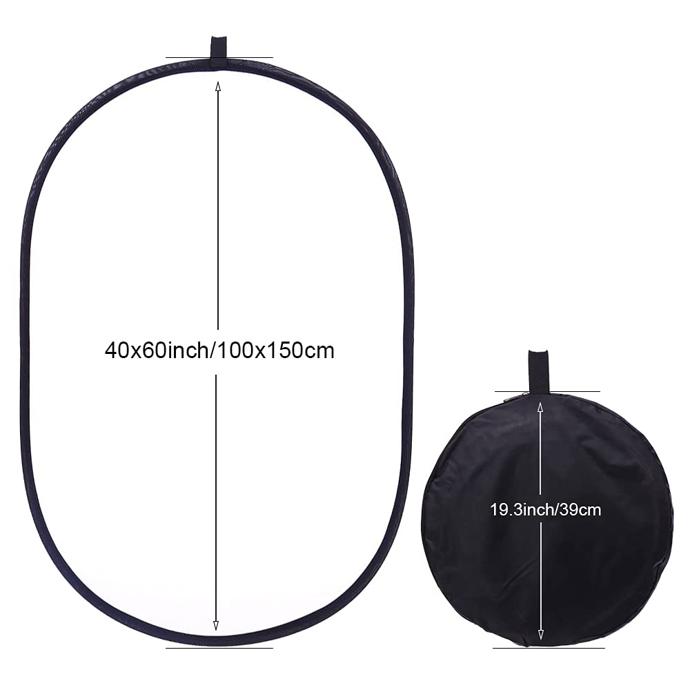 Q: What are the dimensions of the reflector when opened?A: When opened, the reflector measures 100 x 150 cm (approximately 40 x 60 inches), providing ample coverage for various photography needs.