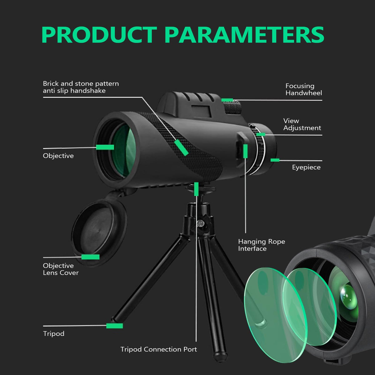 Q: Is this monocular compatible with smartphones?A: Yes, the monocular comes with a smartphone adapter and tripod, making it widely compatible with various mobile phone models for enhanced viewing and photography.