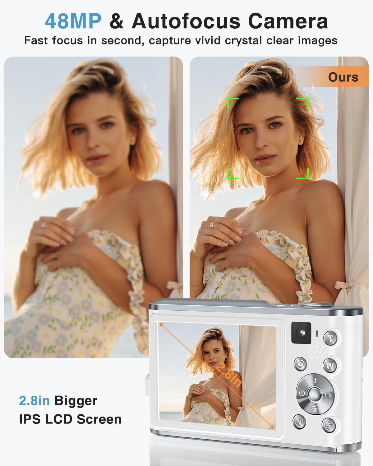 Warm Tips 1. Please Make Sure The Sd Card Is Installed Correctly And Format It Before The First Time Using. 2. We Recommend This Digital Camera To Kids, Teens, Students, Boys, Girls, And Beginners Who Want To Learn Photography And Videography. 3. Please Set The Video Resolution To 4K And The Image Resolution To 48Mp To Get Better Image Quality. 4. Computer Will Show A Better Visual Effect, Please Download The Pictures To Your Pc To Edit Them. 5. Please Read The Manual Before Using It, And If You Have Any Problems, We Will Offer You A Perfect Satisfaction Warranty. Product Specification Video Resolution: Ultra Hd 4K/2.7K/Full Hd 1080P/Hd 720P/Hd 480P Picture Resolution: 48Mp/44Mp/42Mp/36Mp/24Mp/20Mp/16Mp/12Mp/10Mp/8Mp Dual Lens: Front And Rear Lens Self-Timer: Support Autofocus: Support Zoom: 1-16X Digital Zoom, Not Optical Zoom Screen: 3 Inch Ips Display Screen Charging Mode: Adapter(Included) + Type C Cable (Included) Fill Light:Support Time Stamp: On/Off Anti Shake: On/Off Smile Capture: On/Off Face Detect: On/Off Radio Record: Build-In Microphone Webcam: Support Auto-Off: Off/1Minutes/3Minutes/5Minutes White Balance: Auto/Daylight/Cloudy/Fluorescent Storage: 32G Micro Sd Card (Included), Recommend U1 Class 10&Nbsp; (4Gb To 128Gb) Micro Sd Card Package Contents 1X 4K Digital Camera 1X 32Gb Micro Sd Card 2X Rechargeable Battery 1X Portable Lanyard 1X Charging Adapter 1X Type C Cable 1X Carry Bag