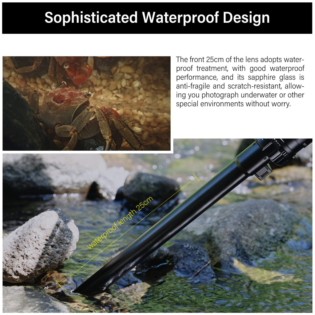 ?Excellent Portability & Shooting In Narrow Spaces?--The Lens Body Is Slender And Can Be Detached Into 2 Sections For Separate Storage, The Aperture Ring And Focus Ring Use A Movie Focusing Gear, Which Is Convenient For The Follow Focus,Providing Portability For Photographers To Go Out For Shooting.And Due To The Special Structure Of The Front Section,It Can Achieve The Purpose Of Shooting In A Narrow Space, Such As Building Miniature Models And Food Setting, Animal Caves, Etc. | ?2X Magnification Macro?--2X Magnification Allows Photographers To Show More Details And Content In Photography.Its Wide-Angle Macro Has A Large Depth Of Field, Which Can Include More Subjects, Better Show Macro Details, And Better Integrate The Subject And The Environment.It Can Also Keep A Certain Working Distance From The Subject, Without Affecting The Subject To Create A More Shocking Picture, Which Is More Conducive To The Photographer'S Creation. | ?Waterproof Design & Sapphire Glass Lens?--The Front 25Cm Of The Lens Is Waterproofed, Allowing The Lens To Go Deep Into The Water (25Cm) For Shooting, Meeting The Needs Of Shooting In Some Special Environments.And The Waterproof Protective Lens Is Made Of Sapphire Glass Material, Which Has High Hardness, Wear Resistance, And Is Not Easy To Scratch, Which Can Not Only Prolong The Service Life Of The Lens,But Also Increase The Application Scenarios That Can Be Used. | ?Ten-Level Adjustable High-Power Fill Light?--The Front Of The Lens Has A Built-In High-Power Ring Fill Light, Which Can Adjust The Brightness At Ten Levels.The Lighting Power Interface Is A Type-C Interface,And The Light Uses A Voltage Of 5V,A Current Of 1 Amp,And A Power Of 5W.It Can Meet The Shooting Of Animal Caves, Pipes, Narrow And Long Gaps, Outdoor Dark Light, Interior Of Small Objects,Product Details,Etc. | ?Compatible?--The Aperture Range Of This Lens Is F13-F40, The Optical Structure Is 21 Elements In 16 Groups,The Length Is About 45.2Cm, And The Widest At The Bayonet Is About 2.3Cm.Compatible With Cine Pl Mount.