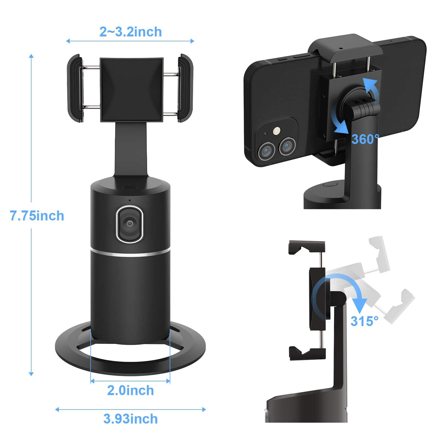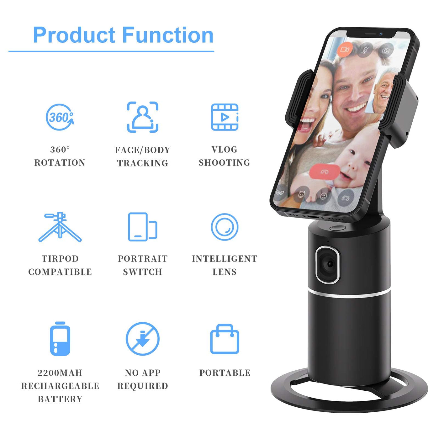 ?: Auto Rotation Tracking: Auto Recognizes And Tracks Your Face Or Body When You Moving In Front Of The Phone Holder. Free Your Hand For Video Calls And Live Streaming,Such As Tiktok Facebook Zoom Youtube Facetime | ?: No App Required: The Tracking Phone Holder Has A Built-In Camera System, Which Can Track And Rotate Intelligently,No Need To Download Any Apps . Without Using The Camera Of The Mobile Phone, You Can Freely Switch All The Functions Of The Mobile Phone When Shooting | ?: Cover Each Angle:360