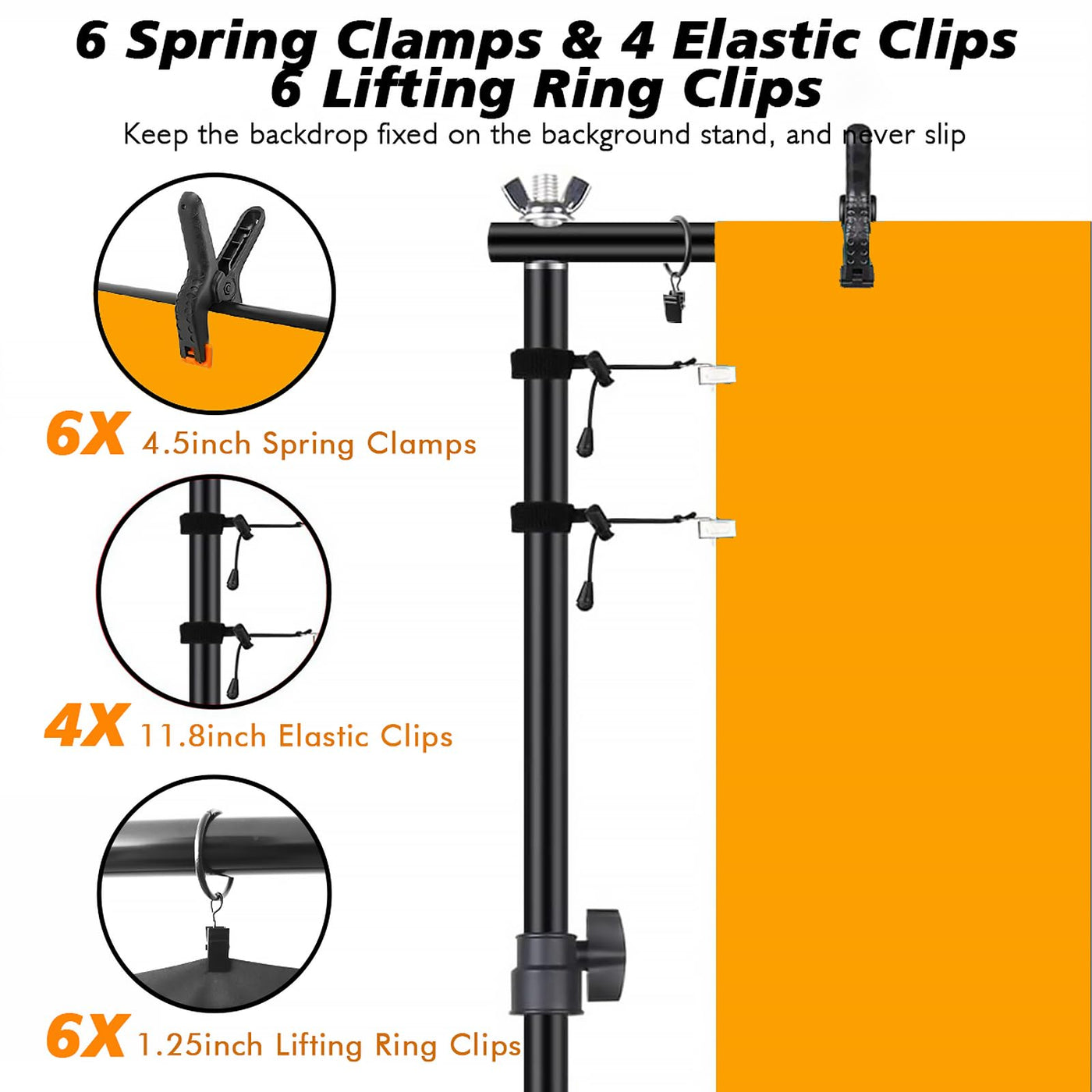 Q: What accessories are included with the Backdrop Stand?A: The Backdrop Stand package includes 6 spring clamps, 6 curtain ring clips, 4 background clip holders, 2 water bags, and a carrying case, providing everything you need for a complete setup.