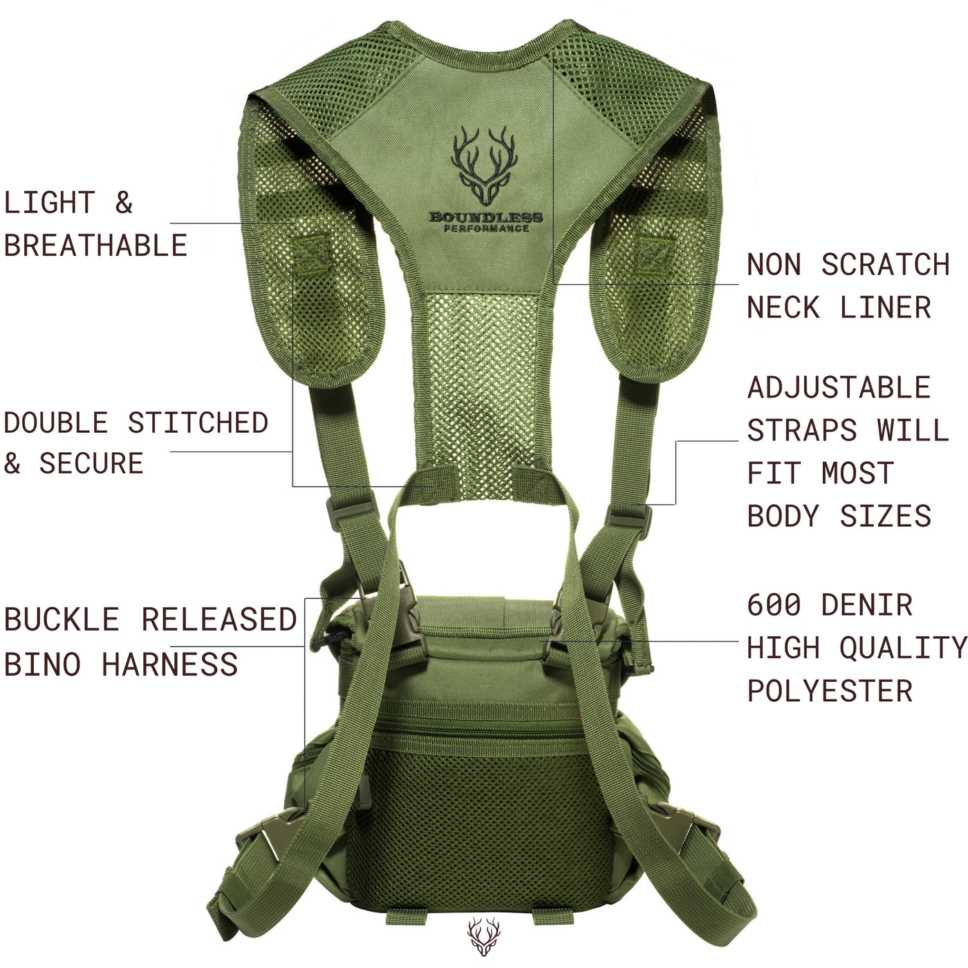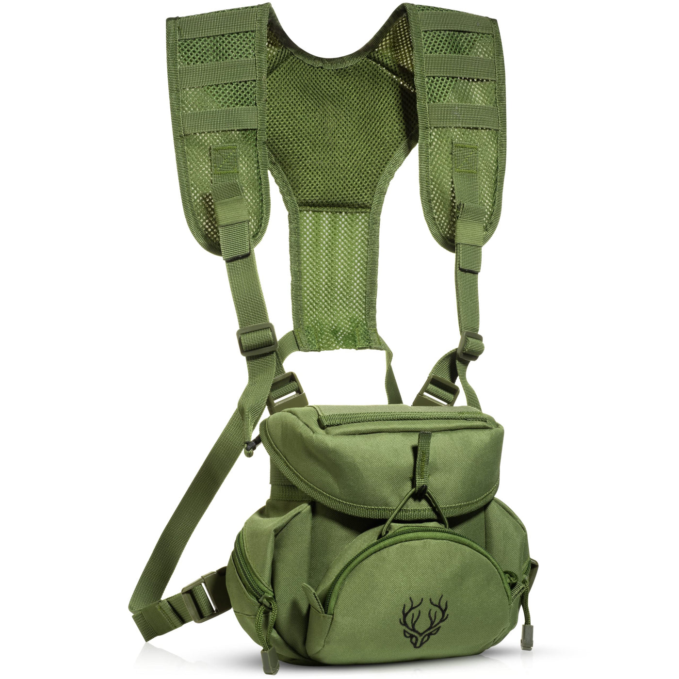 Introducing The Boundless Performance Binocular Harnessour Binocular Hunting Harness Is The Perfect Addition To Any Hunting, Hiking, Or Outdoor Adventure. Furnished With A Binocular Strap System And Many Pockets, You Can Easily Carry And Use Binoculars On The Go!The Main Compartment Of Our Binocular Chest Harness Is 7 Inches Wide X 3.5 Inches Long X 6.5 Inches Deep A Perfect Fit For Most 10X50 And 12X50 Binoculars With 50Mm Objective Lenses.The Front Pocket Is Furnished With Additional Enclosures To Hold Batteries, Bullets, And Range Finders. Side Pockets Are Good For Additional Storage And Small Bags. The Back Flat Pocket Can Be Used For Phones Or Paperwork. Lastly, The Top Elastic Holder Can Be Used For Phones, Whistles, Flashlights, And More!Additionally, Our Bino Pack Is Designed With Ergonomic, Comfortable, And Breathable Polyester Material That Is Quiet And Lightweight. The Binoculars Case Is Double Stitched On The Shoulder And Neck Harness To Secure Your Gear And Last Through The Elements.Full Modularity Allows The Binocular Harness Case To Detach From The Shoulder And Neck Straps For Easy Storage And On-The-Go Changes. The Included Binocular Strap System Is Also Modular Allowing You To Detach The Straps From Your Binoculars Fast And Quietly.Specific Measurements:The Front Range Finder Pocket Is 5.5 Inches Wide X 4.5 Inches Tall X 1 Inch Deepthe Side Pockets Are Roughly 4.5 Inches Tall X 2.5 Inches Wide X 1 Inch Deepthe Top Electric Holder Is 5.5 Inches Long X 3.5 Inches Wide ''Flat''The Back Pocket Is 6.5 Inches Wide X 4.5 Inches Tall ''Flat''Satisfaction Promise:We Are So Confident That You Will Love Your Binocular Chest Pack That We Offer A Satisfaction Promise, If You Do Not Love Your Binocular Case You Can Return It For A Full Refund.Click The ''Add To Cart'' Button Today Risk-Free!