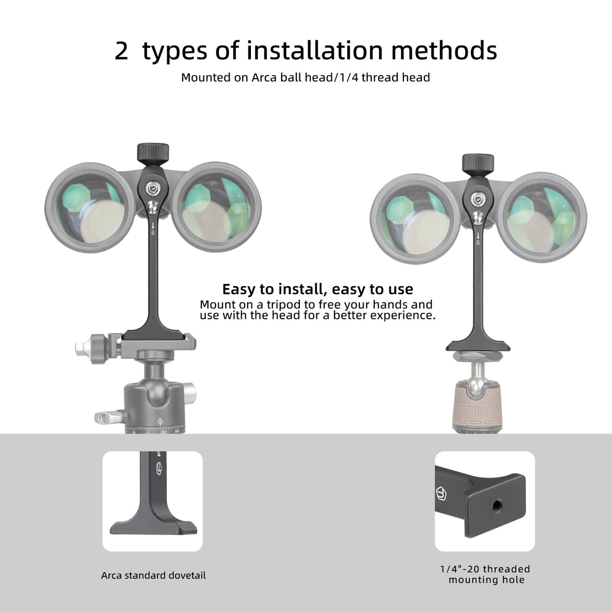 Fanaue Aluminum Binocular Tripod Adapter Quick Release,Detachable Universal Binocular Mount Accessories With 1/4-20 Inch Threading,Compatible With Arca Swiss And 1/4 Thread Head,Easy-To-Use Binocular Tripod Adapter Fanaue Binocular Tripod Adapter Is Made Of Cnc Precision Cut T6061 Aluminum Alloy Body, Strong And Durable, Easy To Carry, Connect Or Disconnect Quickly. And With Detachable Universal Mounting Accessories, It Is A Must-Have Accessory For Outdoor Enthusiasts Because It Has A Unique Quick Release Design That Can Fit All Binoculars. The Adapter Is Designed To Provide A Secureand Stable Mounting Of Your Binoculars On A Tripod, And It Has A 1/4-20 Inchthreading That Ensures A Snug Fit. Additionally, It Features An Anti-Safetyunlock Mechanism To Prevent The Telescope From Accidentally Slipping Off. Thisfeature Is Particularly Useful When You Are Using Your Binoculars In Harshoutdoor Conditions, Such As Windy Weather Or On Uneven Terrain.