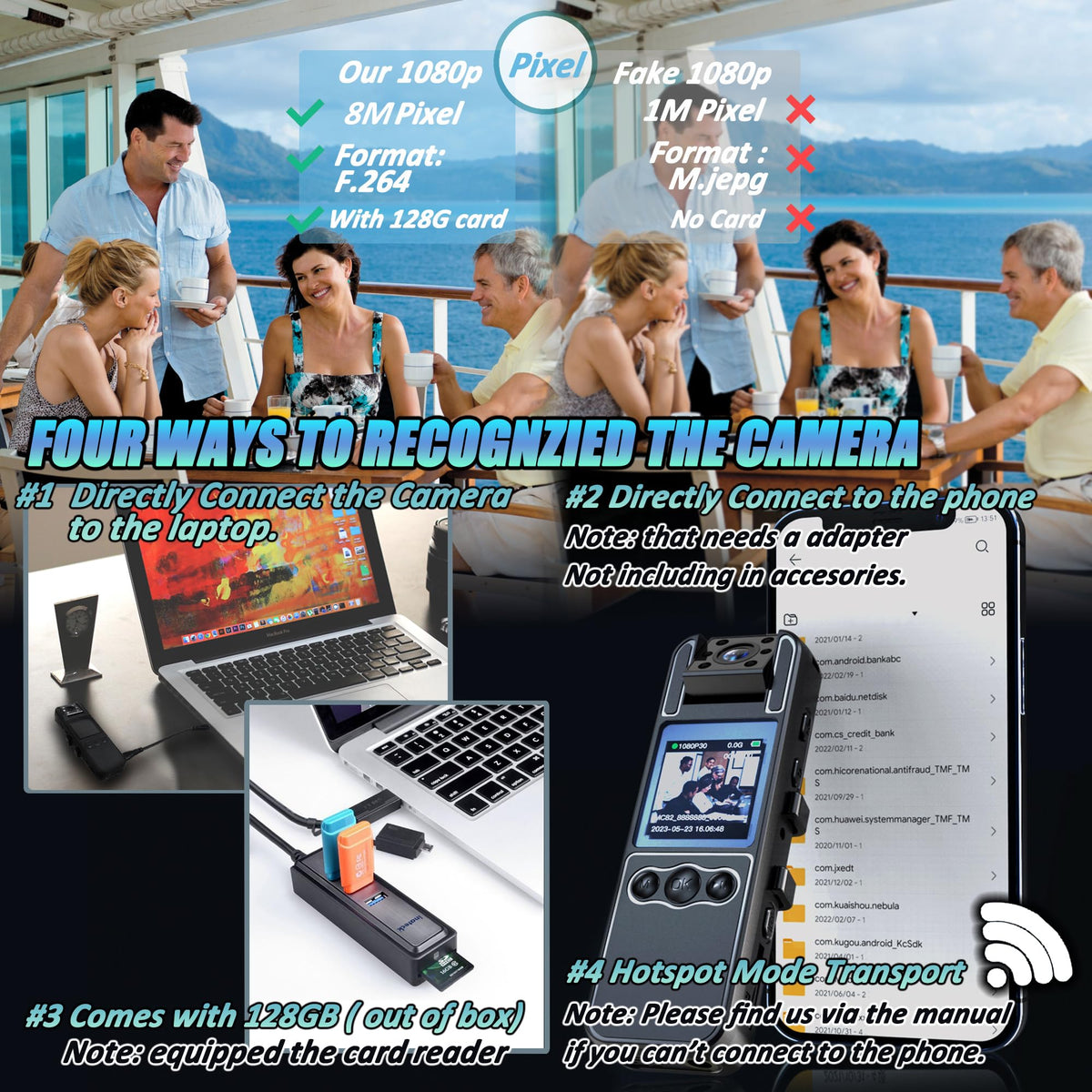Q: What storage capacity does the body camera have?A: The body camera comes with a built-in 64GB memory card, providing ample storage for long recording sessions and is compatible with cellphones, laptops, and PCs for easy replay.
