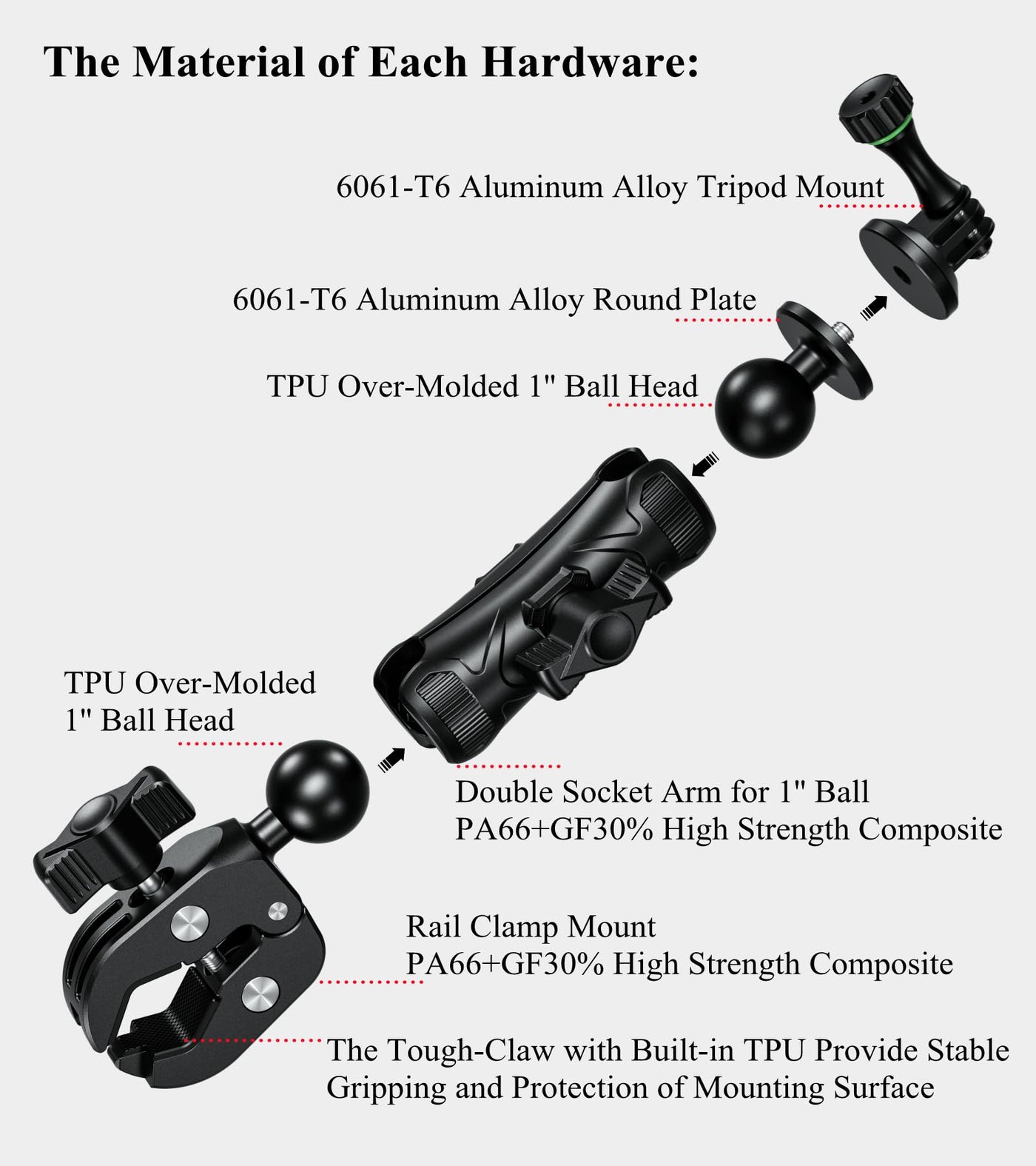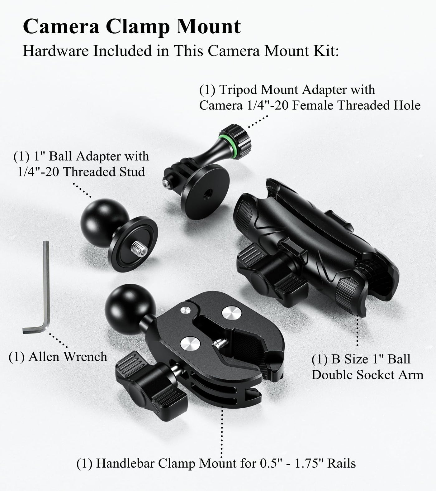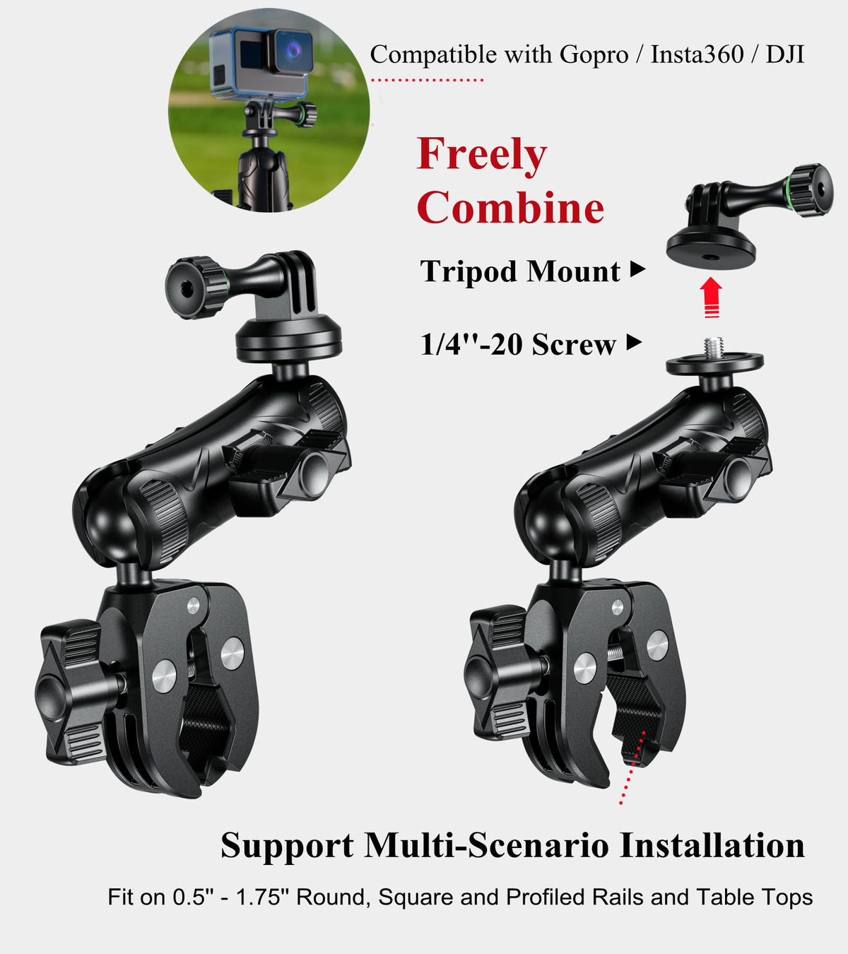 The Camera Mount Kit With Handlebar Clamp Mount & B Size Double Socket Arm & Tripod Mount Adapter & 1/4'-20 1'' Ball Adapter, Compatible With Gopro Hero 11, 10, 9, 8, 7, 6, 5, 4, 3+, 3, 2, 1 Hd, Hero 2018 Action Camera, Fit For Dji Osmo Action Camera