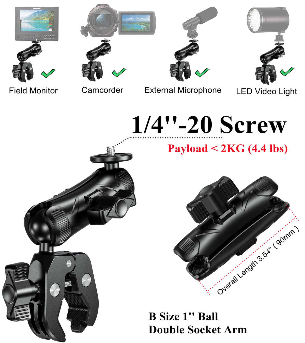 Brcovan Super Clamp Camera Mount With 1'' Ball Head 3.54'' Magic Arm, With 1/4' 20 Screw Tripod Mount Adapter, For Action Camera, Camcorder, Monitor, Led Lights And More