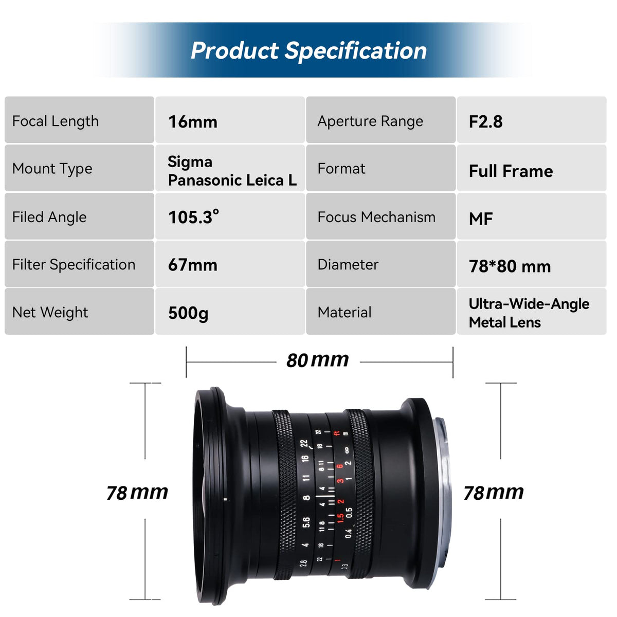 Brightin Star 16Mm F2.8 Full Frame Ultral Wide Angle Manual Focus Mirrorless Camera Lens, Fit For L Mount Leica Sl, Sl2, T, Tl,
