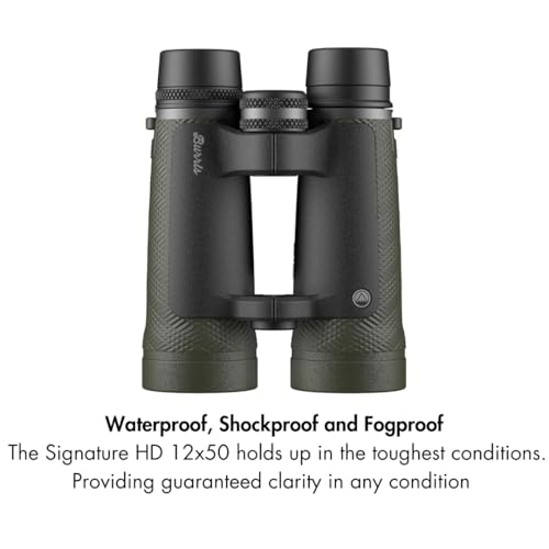 Q: What are the key features of the Burris Signature HD 12x50 Hunting Binoculars?A: The Burris Signature HD Binoculars feature high-performance HD lenses and BaK-4 prisms for sharper images and edge-to-edge clarity. They also include multi-coated lenses for maximum light transmission, a 12x magnification with 50mm objective lenses, and are nitrogen-filled for waterproof, fogproof, and shockproof performance.