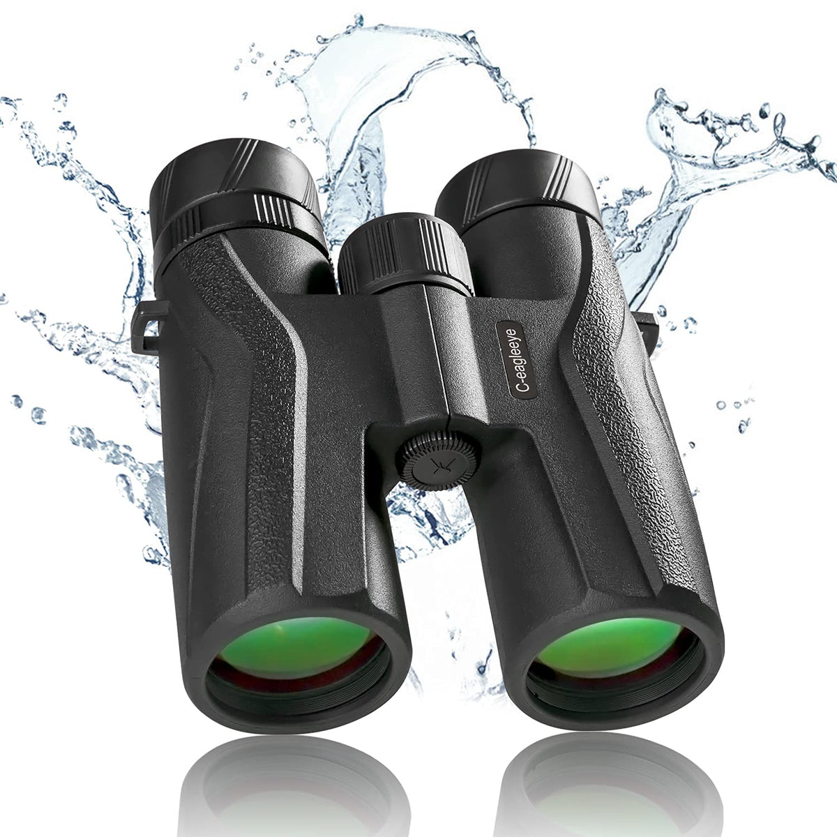 Q: What are the key features of the C-eagleEye Binoculars 10x42?A: The C-eagleEye Binoculars feature a 10x magnification, 42mm objective lens, and a large 23mm eyepiece for enhanced clarity. They are waterproof and fog-proof, designed for durability in various weather conditions. The binoculars also utilize high-quality BAK4 prisms and FMC multi-layer coatings for superior image quality.