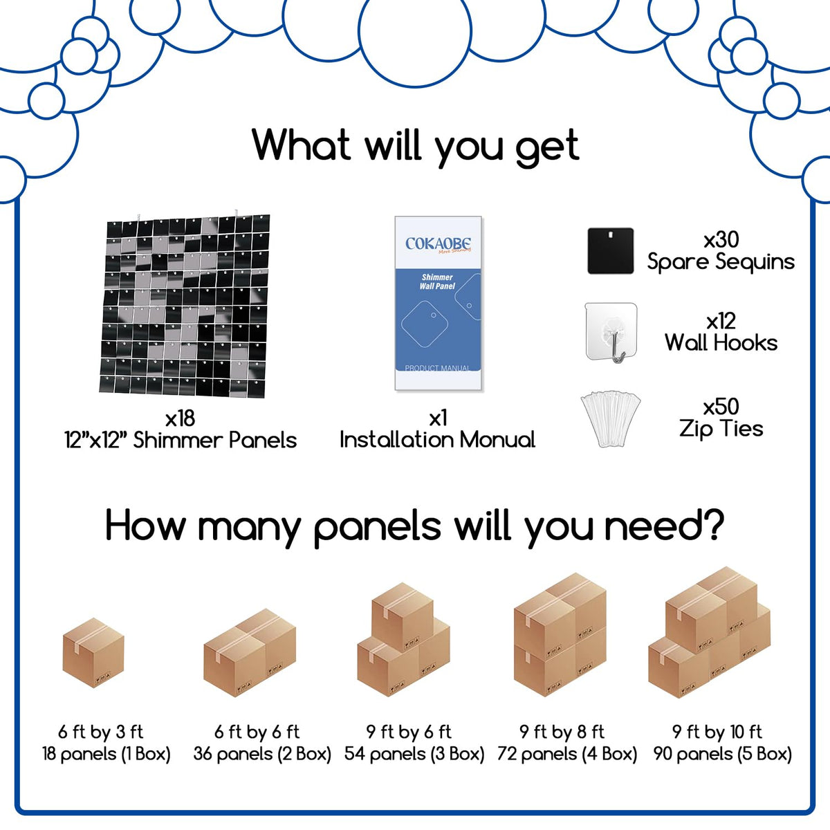 Q: Does the package include everything needed for setup?A: Yes, the package includes 18 shimmer wall backdrop panels, 30 spare sequins, 50 zip ties, 12 wall hooks, and 1 installation manual, providing you with everything needed to create a stunning backdrop without additional accessories.