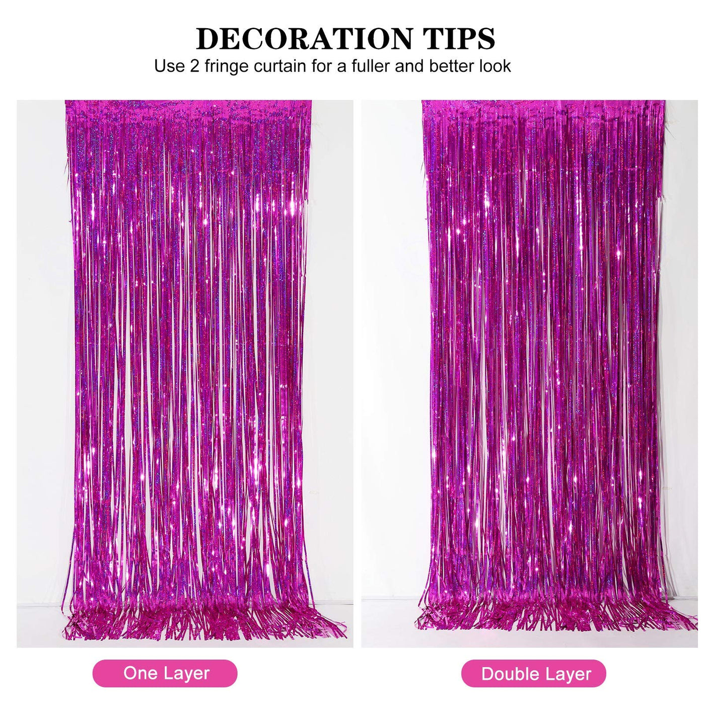 Let'S Start Wonderful Party With Foil Curtain Everyone Loves Party! We Are So Glad To Recommend You A Gorgeous Product For Party Backdrops,Enjoy The Party With This Fringe Curtain Backdrop Our Foil Striped Rain Curtain Curtains Which Are Suitable For Any Theme Birthday Wedding Baby Shower Or Other Celebration Party Decorations. Lightweight And Durable Curtain Backdrop You Can Double Layer This Backdrop Curtain Set If You Want More Perfect Effect Why Choose Us This Foil Fringe Curtain Which Will Hang Effortless Above Door,Windows Or Wall,New Laser Model Unique,Giving You A Stunning Backdrop Shimmer Equipped With Free Double-Sided Tape On The Back Of Each Curtain(No Other Tools Are Needed) The Adhesive Tape Is Specially Designed For Household Wall So That You Can Safely Use It On Stable Wall Finishes To Temporarily Hang Lightweight Party Decor The Beautiful Tinsel Backdrops Are Good For Serving As Party Decorations, Photography Curtains, And So On; You Will Be Surprised At The Atmosphere And View They Create, They Can Add Sparkle As Decorations For Parties While Bringing Fun For Your Friends Or Families Specifications Material: Metallic Tinsel With Laser Design Color: Foil Fringe Curtain With Laser Model Width: 1 M/ 3 Feet Length: 2.5 M/ 8 Feet Package: 2Pcs