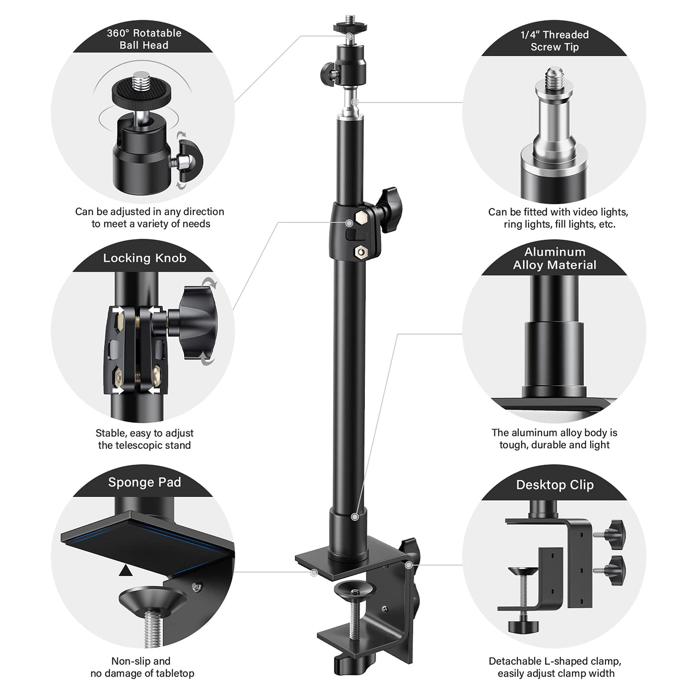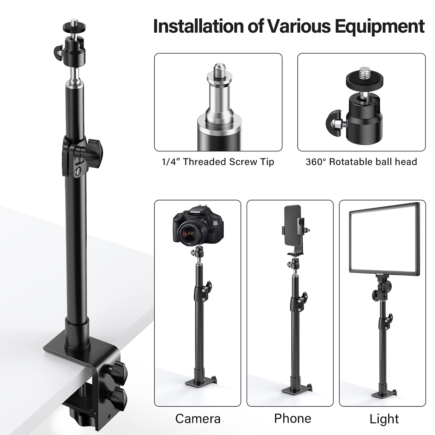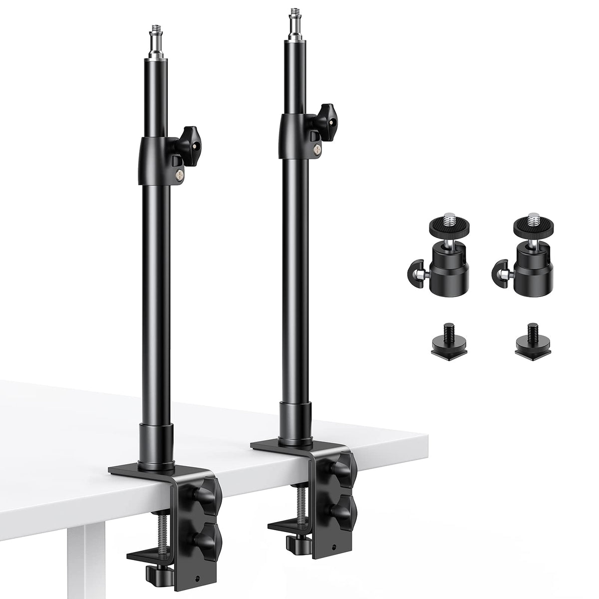 About Dazznedazzne Always Aim To Provide Our Customers With High Quality Products And Great Customer Service At Photography Field. We Produce Tripods, C-Clamp Desk Mount For Camera, Smart Phone And Panel Light, Led Video Light For Youtube Live, Outdoor Video Photography, Studio, Etc. Product Overview--Dazzne Desk Mount Stand Is Made Of Highly-Durable Aluminum Alloy Which Can Be Adjustable To From 12.9 Inch(32.7 Cm) To 22 Inch (56 Cm) . --These Desk Clamp Stand With Standard 1/4 Screw Can Be Mounted For Most Photography Equipment, Such As Ring Light, Dslr Camera, Video Camera, Panel Light, Key Light, Led Video Light, Webcam, Streaming Accessories Etc.--Support Thickness Of Desktop From 0.6 Inch(1.5 Cm) To 3.4 Inch (8.8 Cm).--360 Degree Rotation Swivel Ball Head With The Locking Knob Allows You To Adjust At Any Angle.--The Base Is 2.7 Inches Long And 1.9 Inches Wide, There Is A Sponge On The Base, It Non Slip And Protects Your Desktop Better..--Max Load:10 Lbs/4.5 Kg.Package Includes:--2* Desk Mount Stands--2* Ball Heads--2* Cold Shoe Mount Adapter