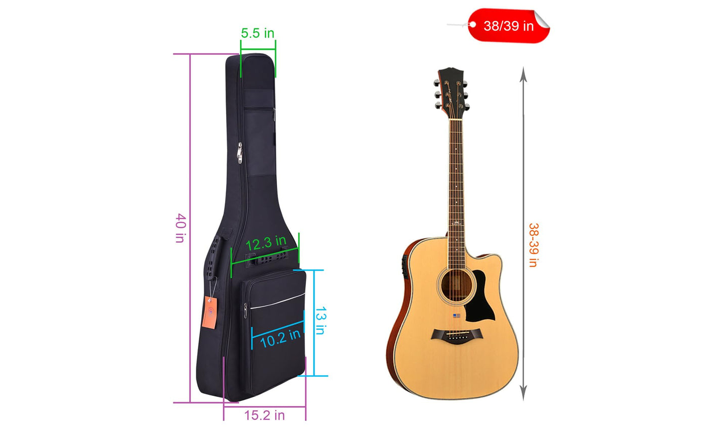 38 ''And 39'' Universal Acoustic Guitar Bags. Oxford Cloth Is Strong And Durable. 0.35-Inch Thick Cotton Padding Fits The Guitar Perfectly, Providing 360 Protection Without Bulkiness. It Can Not Only Prevent Collision And Damage, But Also Effectively Prevent Dust, With A Certain Waterproof Effect. High Quality Lining Is Durable And Not Easy To Damage. The Guitar Bag Has Three Pieces Of Anti Friction Fabric, Which Is A Reinforced And Upgraded Anti Friction Inner Piece. When It Touches The Hard Part Of The Guitar, It Can Effectively Protect The Interior Of The Guitar And The Guitar Bag. This Is Definitely A Bright Spot. Two Way High-Quality Metal Pull Head And Thickened Nylon Pull Cloth Are More Smooth And Durable. With Two Silicone Handheld Acoustic Guitar Bags, Users Can Carry Them In More Ways, Making Travel More Convenient. The Strap Has A Ring For Easy Storage. The Upper Pocket Of The Guitar Case Can Be Used For Placing Tuners, Clips, Connecting Cables, Guitar Paddles And Other Items. The Large Front And Bottom Pockets Of The Guitar Bag Can Hold Music Folders And Other Items, And The Lower Pockets Are Full Of Sponges, So You Can Also Put A Tablet Computer. The Thickened Arc Shoulder Strap Is More Comfortable To Use. He'S Definitely A Good Value For Money Guitar Case