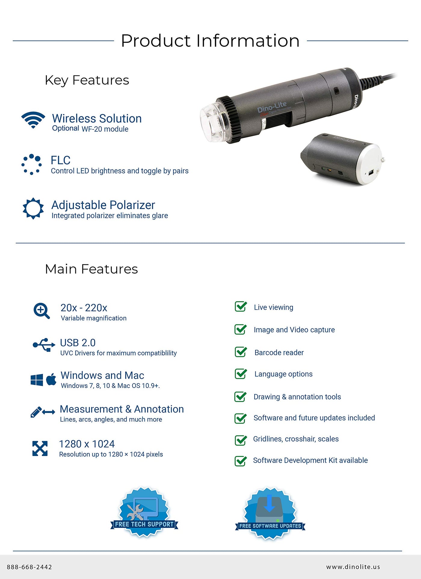 The Dino-Lite Edge 1.3Mp Af4115Zt Is Designed To Meet Most Professional Applications Within 20X- 220X Magnification Range. Measurements Can Be Performed In Different Units (Inch/Mil/Mm/Um) And Types Including Straight Lines, Circles, Angles, Arches Grids And More. The Microtouch Feature Is A Touch Sensitive Area Which Can Be Used To Capture Images Instead Of Using A Keyboard And Mouse. The Software Also Allows Users To Disable The Microtouch, Or Set To Single Or Double Touch To Trigger. Polarization Can Be Switched On/Off Or Can Be Adjusted To Offer Full Or Half Polarization For Controlling Glare. The New Modular Wireless-Ready Design Allows For Usb Connection Or A Quick Swap To Wireless With A Wf-20 Adapter (Sold Separately) Making It A Completely Cordless And Portable Microscope. Product Note: The Af4115Zt Has Replaced The Model Am4115Zt