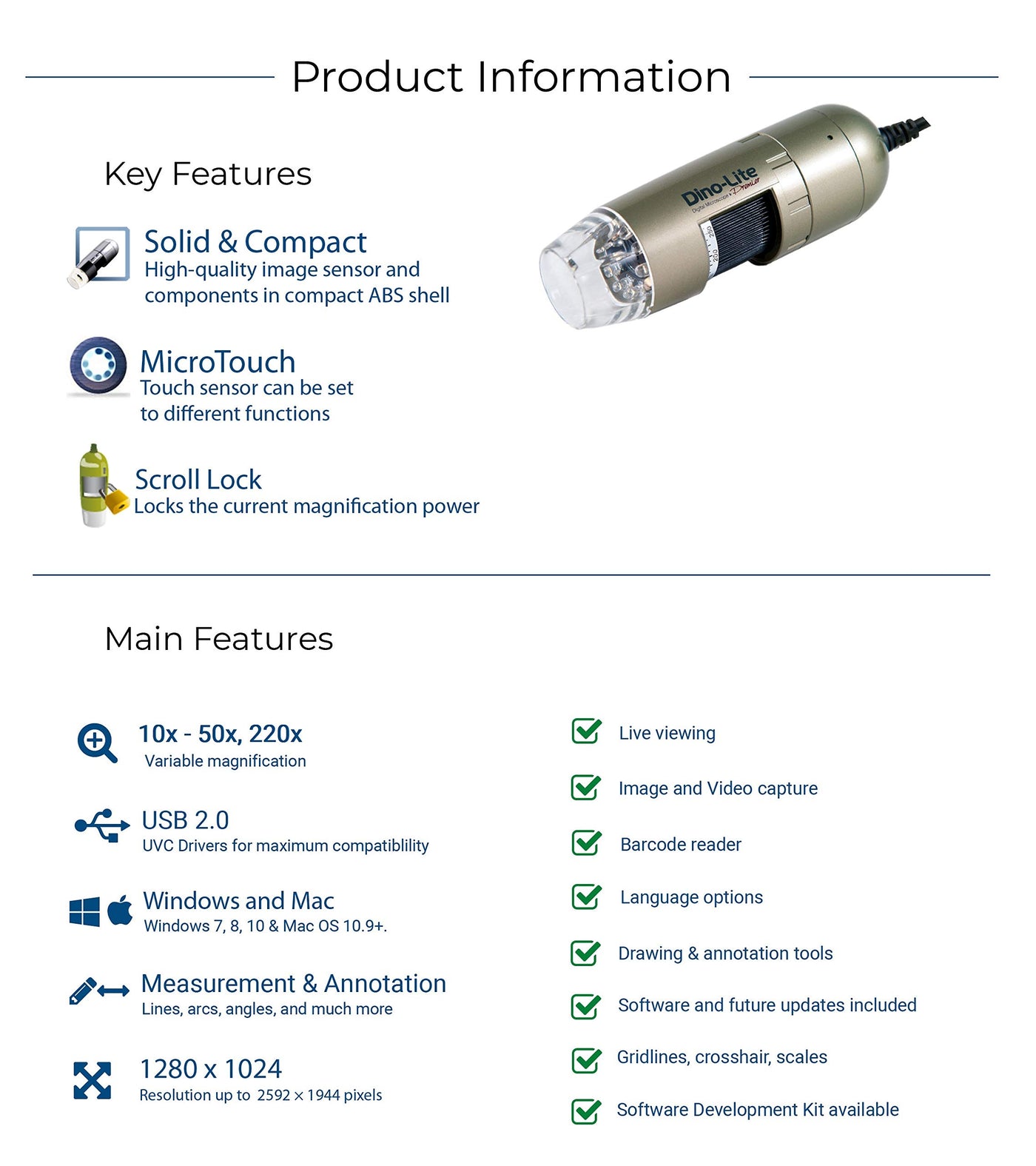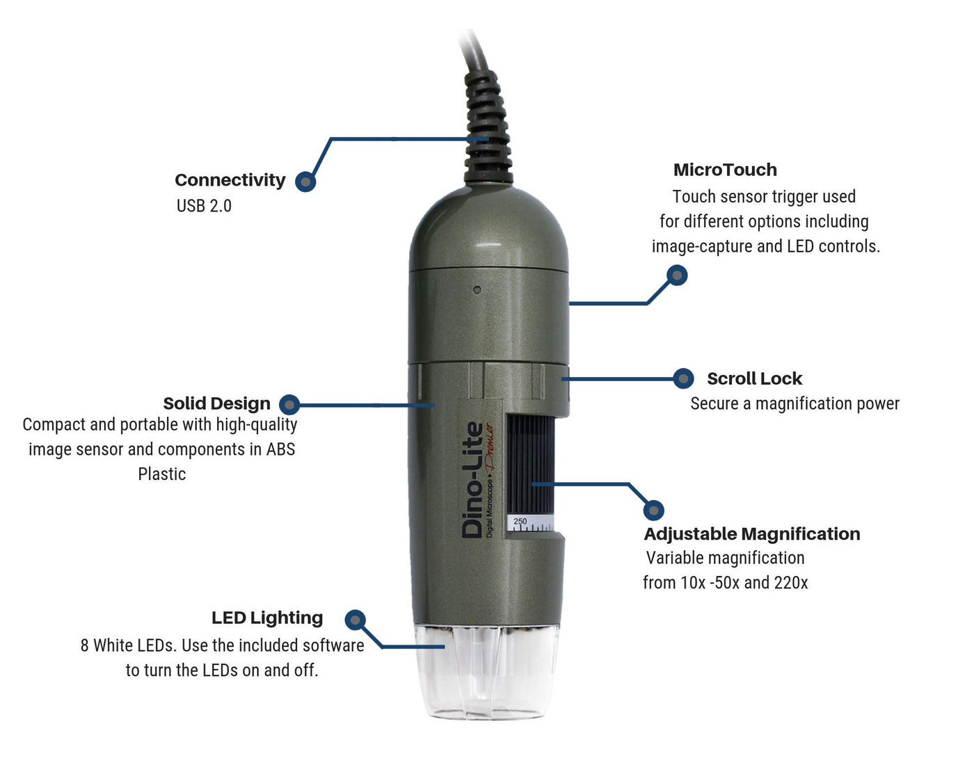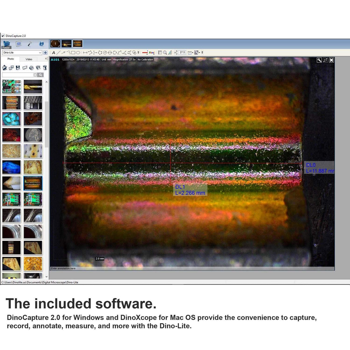 The Dino-Lite Is The Most Popular Handheld Digital Microscope In The World. Our Hardware And Software Set These Microscopes Apart From The Rest. Get Premium Imaging With Dino-Lite Quality Hardware And Software Features. Plug Into A Computer And Use The Live Image To Inspect And Analyze. Dino-Lite Includes Dinoxcope Software For Macintosh Computers With Os 10.4(And Up) And Dinocapture 2.0 For Windows Xp, Vista, 7, 8 And 10 Operating Systems. This Model Is Featured With The Unique Microtouch Snapshot Feature. The Microtouch Feature Is A Touch Sensitive Area Which Can Be Used To Capture Images Instead Of Using A Keyboard And Mouse. The Software Also Allows Users To Disable The Microtouch, Or Set To Single Or Double Touch To Trigger. Capture In Full Detail With Resolution Up To 1280 1024 Pixels. Use Simple Tools To Draw Lines, Shapes, And Text Annotations On The Image. Measurement Features Are Accessed In The Included Software. Measurements Can Be Performed In Different Units (Inch/Mil/Mm/Um) And Types Including Straight Lines, Circles, Angles, Arches Grids And More.