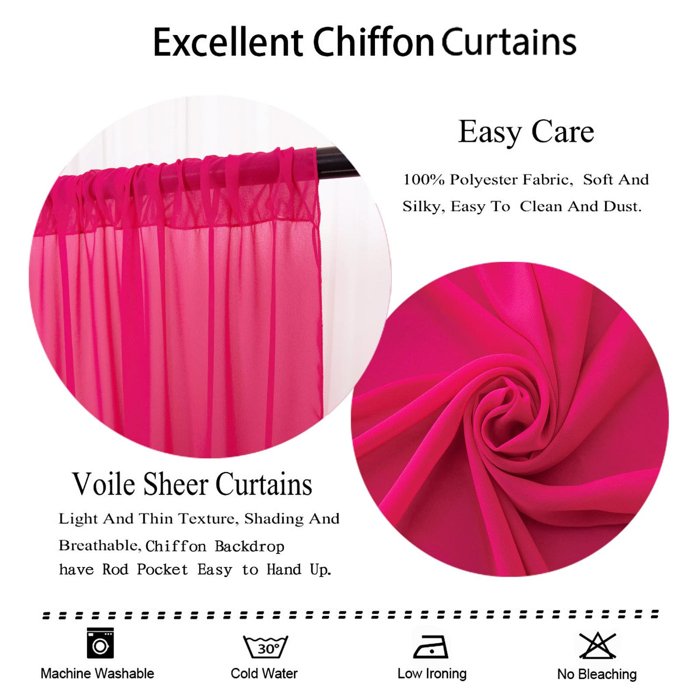 ? Sheer Chiffon Curtains :Includes 2 Panels Width 29 Inches (Total Width 58 Inches For 2 Panels) Chiffon Backdrop Curtain Hot Pink Color--Different Electronic Devices Seeing The Image Colors Will Different . Please Refer To The Actual Product For Specific Color. | ? Easy To Mount : With A 4 Inches Rod Pocket Across The Top For Easy Hanging On A Pipe Or Stand.Avoid Sharp Items Or The Shower Curtains May Be Damaged. | ? Elegant Chiffon Backdrop: Wedding Chiffon Backdrop Drapes Ideal For Parties,Weddings,Baby Shower,Bridal Shower,Birthday Party,Graduation, Photo Booth Props,Hen Party,Ceremony, Engagement,Anniversary, 21 Birthday , Baptism, Housewarming Party Or Other Event Decor, Beach Curtains For Living Room. | ? Premium Material : Tulle Backdrop Curtains Chiffon Backdrop Drapes Material Fabrics Has Unique Sightly Shinny Looking, Semi-Sheer In More Of An Off White Tone. Smoother And More Graceful Than Tulle Or Nylon Curtains. And Its Wrinkle-Resistant And Can Be Reusable. | ? Care Instructions: Machine Wash With Cold Water, Gentle Cycle. Use Only Non-Chlorine. Bleach As Needed. Tumble Dry Low. Iron On Lowest Setting As Needed.