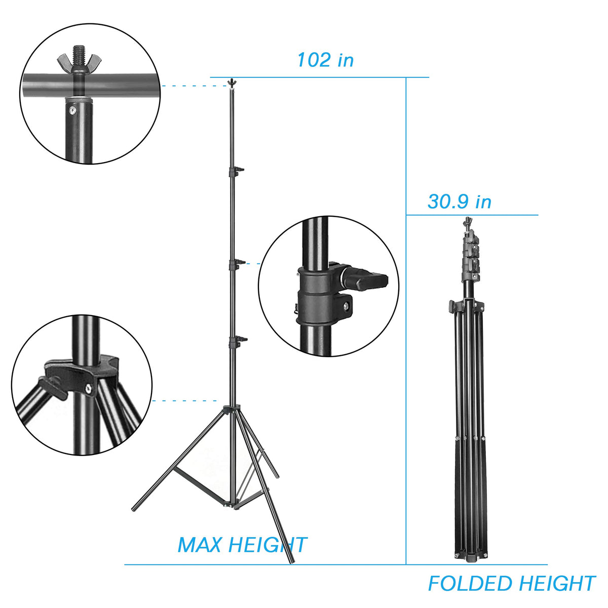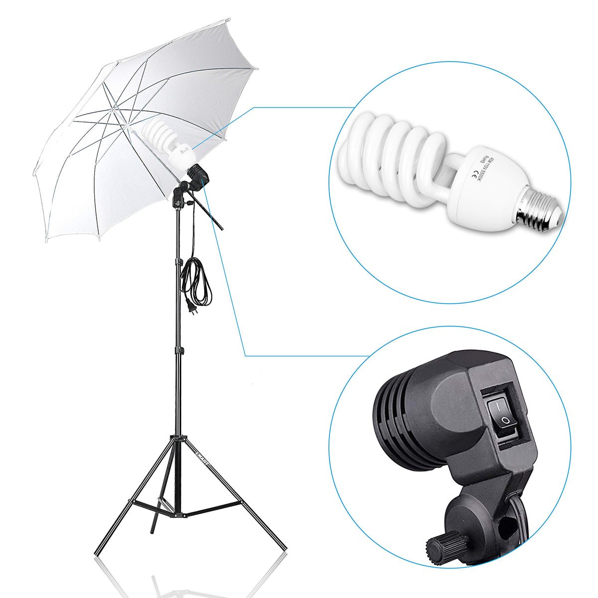 This Studio Flash Lighting Kit Is A Professional Kit With Everything You Need. Suitable For Professional And Amateur Photographers. With This Setup You Are Ready For Fashion Shots, Product Shots, Photographic Reproduction, Collectables, Video Filming Etc, Or Pack It All Up As A Travel Set For Those Weddings Or Location Shots. Content: 2*45W Bulb 2*Light Stand 2*Muslin Backdrop (White &Amp;Black) 2*Spring Clamp 1*Backdrop Stand 2*Soft Umbrella 4*Background Clip 2* Lamp Holder 1*Portable Carry Bag 2*Reflector Umbrella (4 X ) Crossbar Min Length: 5 Ft (2 Crossbar) Max Length: 10 Ft (4 Crossbar) Each Crossbar Extends To 5 Ft Interlock 2 Crossbars Into A Long Crossbar Cross Bar Consists Of Four Sections,Making The Light Stand Simple To Adjust The Width. (2 X ) Backdrop Support Stand 100% Aluminum Construction Max Height: 8.5 Ft Min Height: 3 Ft Folded Height: 30.9 Inch Max Weight: 17.6 Lb 2 X 83'' Light Stand Die Cast Aluminum Construction Sections: 3 Folded Height: 28'' Maximum Height: 83'' Min. Height: 28'' Diameter Of Legs: F0.63'' Lamp Base: E26/E27 Umbrellas Are Easy To Work With, And Very Handy To Transport. Out Of All The Types Of Umbrella Reflectors, This One Will Be Able To Produce An Image With The Least Contrast And The Softest Light, Because The Majority Of The Hard Light Is Going To Be Eaten Up In The White, Slightly Reflective Material. Energy Saving Compact Fluorescent Spiral Bulb Save Energy Up To 80%. Color Temperature: 5500K 45W, Equals To 200W Regular Incandescent Light Bulb Output Spiral Shape Design Daylight Lighting Tone Adjustable Angle To Control Your Light Bulb