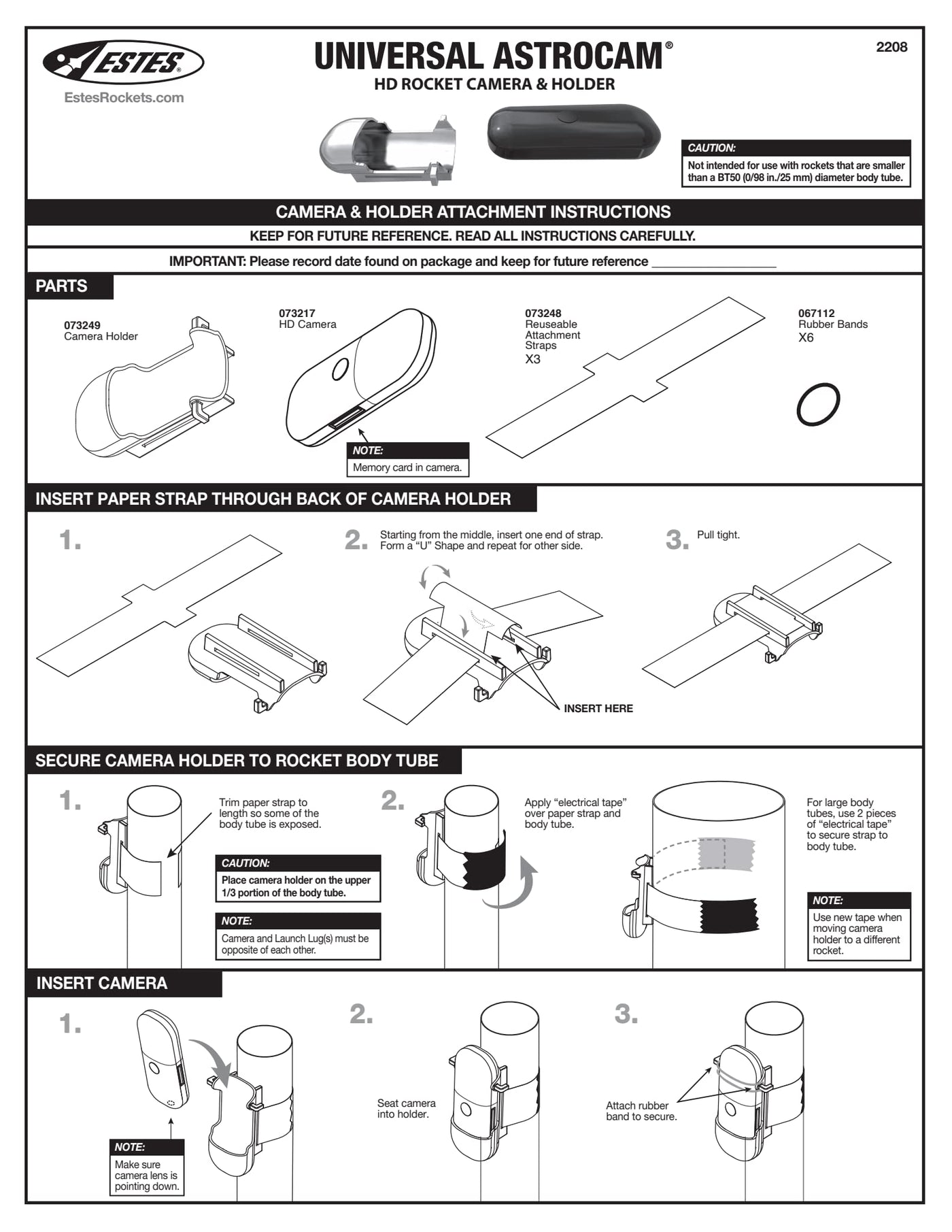 Q: What types of rockets is the Estes Universal Astrocam HD compatible with?A: The Estes Universal Astrocam HD is designed to be compatible with almost any rocket, allowing you to easily attach it using the included straps. This versatility makes it ideal for various rocket models.