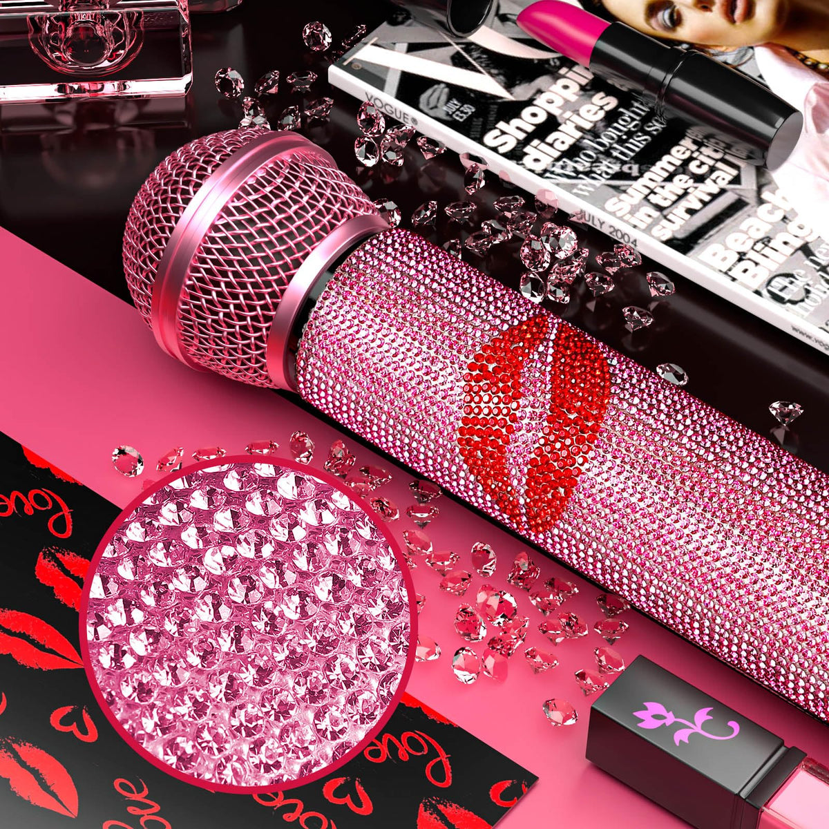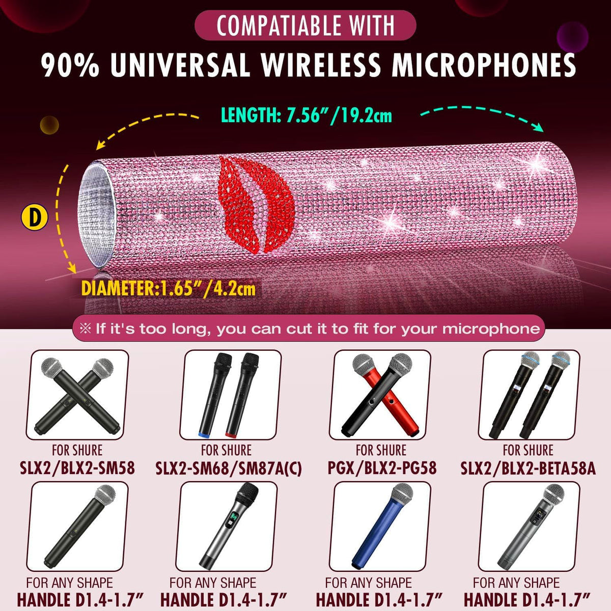 Facmogu Pink Rhinestones Handle Cover, Red Lips Glitter Mic Sleeve For Wireless Microphone, Sparkly Crystal Mic Cover Sleeve, Be