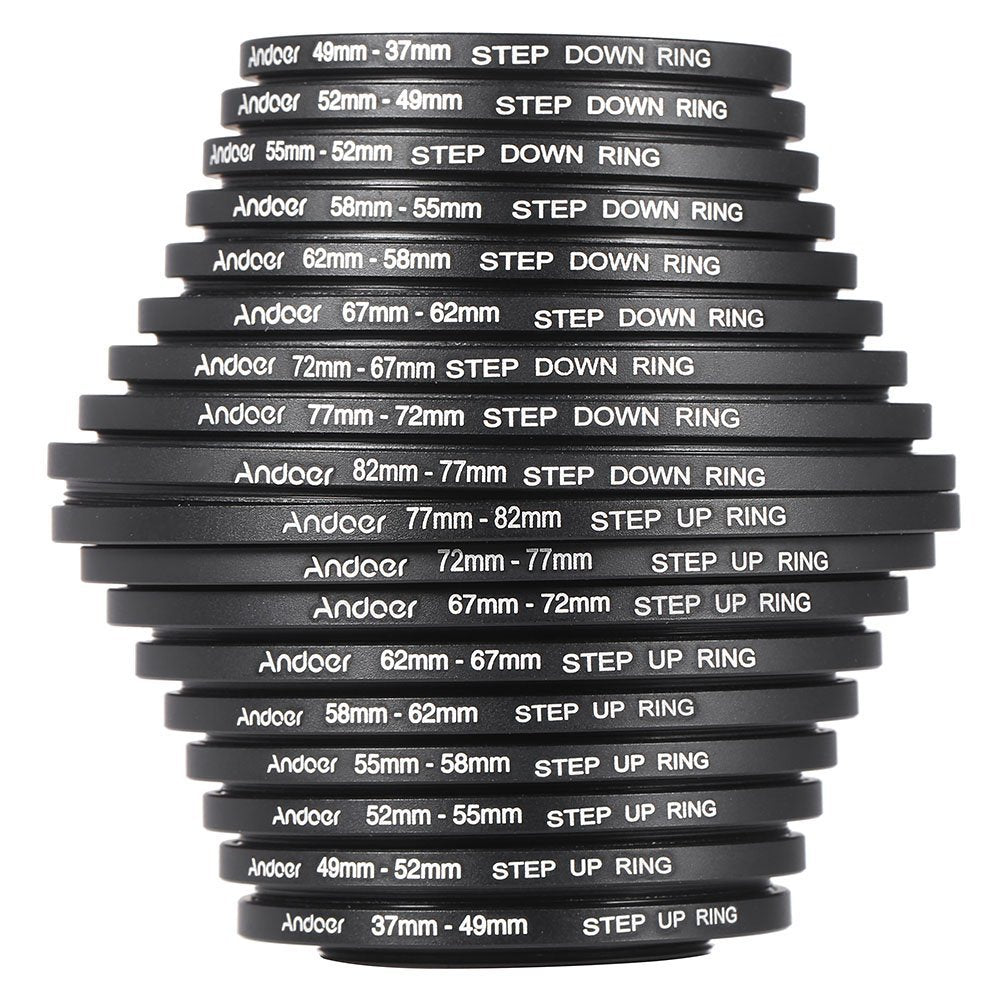 Filter Ring Adapter, Andoer 18Pcs Camera Lens Filter Metal Adapter Ring Kit (9Pcs Step Up Set & 9Pcs Step Down Ring Set)