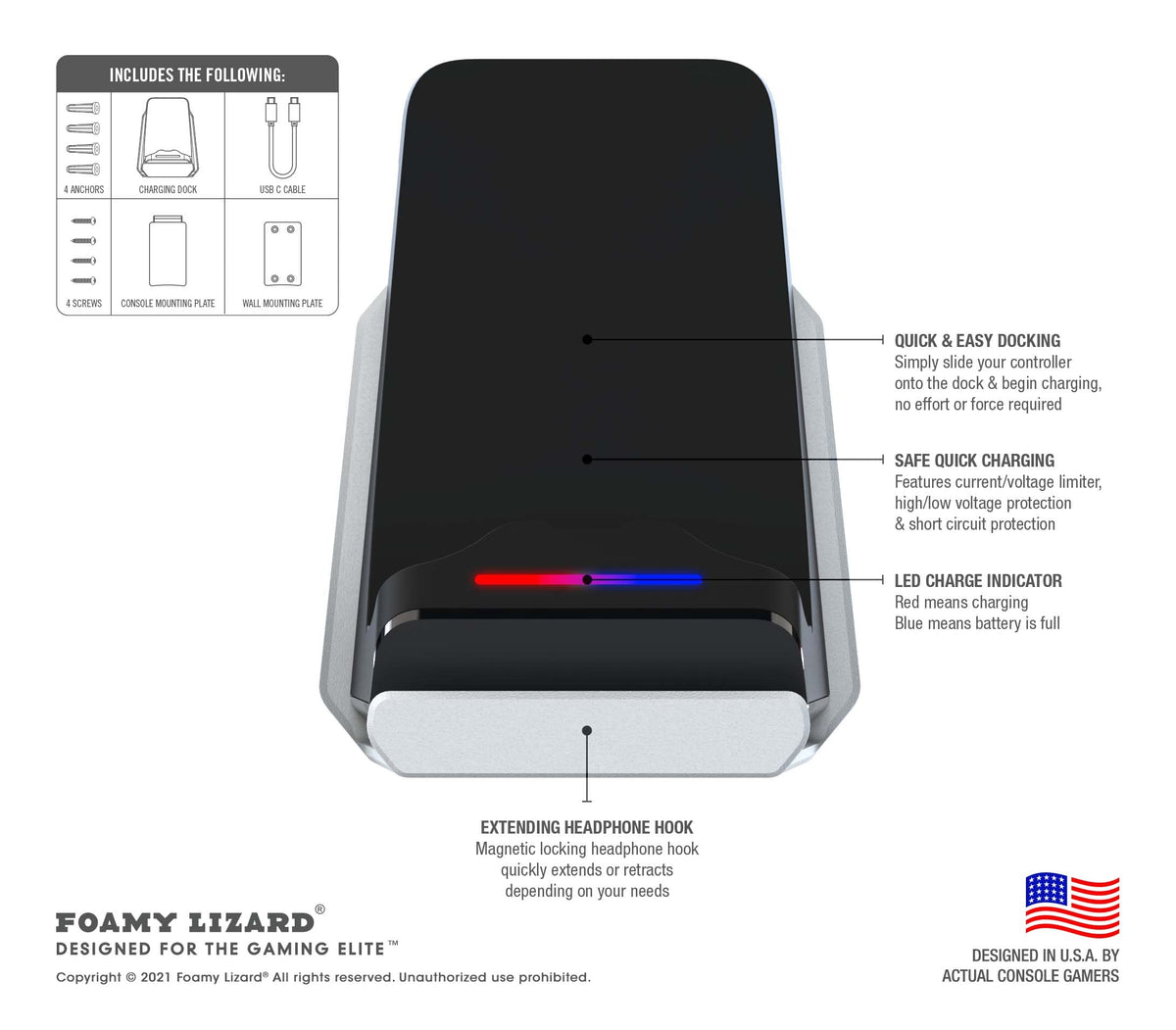 Please Note: Charger Will Not Fit New 2023 Edge Controllersleek Seamless Design | Designed To Blend In With Your Ps5 Console & Your Playstation 5 Controllersquick Charge | 2.5Hr Full Charge, Simply Place Your Controller Down On The Contact Points And The Charging Begins, No Additional Downward Force Or Adapters Requiredwall Or Console Mounting | Includes A Slide In Console Mounting Plate As Well As A Wall Mounting Screw Plate With Required Hardware Extending Headphone Hook | The Extending Headphone Hook With Magnetic Closure Allows You To Store Your Gaming Headset All In One Compact Convenient Location Safety Circuitry | Features Current/Voltage Limiter, High/Low Voltage Protection, Over Current & Short Circuit Protection Please Note: If The Led Is Flashing Your Power Source (Usb Wall Plug) Is Either Too High Or Low A Current, Swap To A Different Port. Tested And Compatible With Foamy Lizard Sensepro Skins However Dock May Not Be Compatible With Other Third-Party Skins. Quickly & Easily Charge Your Ps5 Controller With The Foamy Lizard Sensepro Mounted Charging Dock. Get Yours Today!