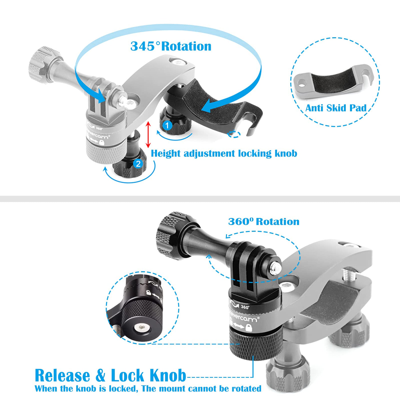 Forevercam Bike Handlebar Mount For Gopro (360� Rotation And Lock Any Direction) 0.6 1.3Inch All Aluminum Bike/Motorcycle Handlebars Seat Post Ski Pole Mount For Gopro Hero 8/9/10/11/12/13(Black)