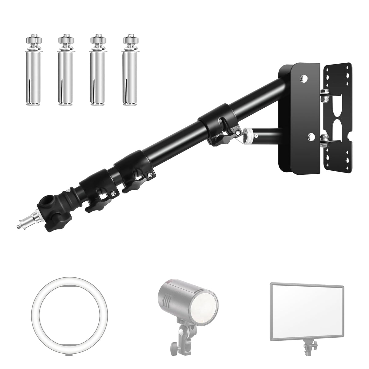 Features Solid & Stable: Made Of High Quality Aluminum Alloy Construction, Durable And Stylish. The Triangle Structure Adds Stability To The Boom Arm. Space Saver: It Would Be A Perfect Choice If You Want A Solid Attaching Boom Arm That Can Effectively Go Up And Down, In And Out With A Large Amount Of Range. Making The Workspace Tidy And Organized. Dual-Swivel Design: You Can Swing The Wall Mount Arm 0-180 Up And Down Or 0-160 Side To Side For Various Angle Adjustments Adjustable Length: The Length Can Be Extended From 29.5In/75Cm To 52In/132Cm To Suit Your Different Requirements. Secure Mounting: Comes With 4 Pieces Expansion Screws Helping Mount The Boom Arm On The Wall Firm And Secure. Please Make Sure To Mount This Boom Arm On A Solid Wall. Do Not Mount It On Non-Load-Bearing Walls. Great Compatibility: The Wall Mount Boom Arm With 1/4 And 3/8 Threaded Ends Are Compatible With Most Equipment Such As Strobe Lights, Monolight, Ring Lights, Softbox, Reflectors, Dslr And Microphone, Etc. Wide Application: The Ring Light Wall Mount Arm Swivel Is Great And Universal For Create A Studio For Vloggers, Streamers Photographers, Personal Workshop, Beauty Shop, Tattoo Studio, Music Studio, Barbershop Etc. Easy Installation 1. Mark The Hole Location And Punch The Hole In The Wall/Ceiling With The Tool. 2. Put The Expansion Screws In The Wall /Ceiling And Fix It. 3. Fix The Wall Mount Boom Arm With Expansion Screws. 4. Attach Ring Light Or Other Equipment To The Extension Arm. 5. Adjust The Length And Angel Of The Wall Mount Boom Arm. 6. The Installation Is Complete. Specifications Material: High Quality Aluminum Alloy Extension Range: 29.5-52Inch / 75-132Cm Weight: 5.2Lb / 2.35Kg Load Capacity 6.6Lb / 3Kg Package Included 1 Wall-Mounted Boom Arm 1 X 1/4'' Screw 3/8'' Screw 4 Expansion Screws