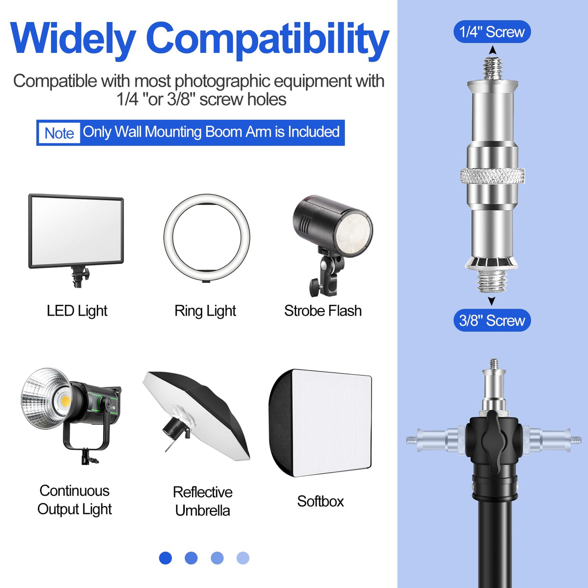 Q: Is this boom arm compatible with all types of lighting equipment?A: The FUDESY boom arm is designed with 1/4” and 3/8” threaded ends, making it compatible with most lighting equipment including strobe lights, monolights, ring lights, softboxes, and DSLR cameras.