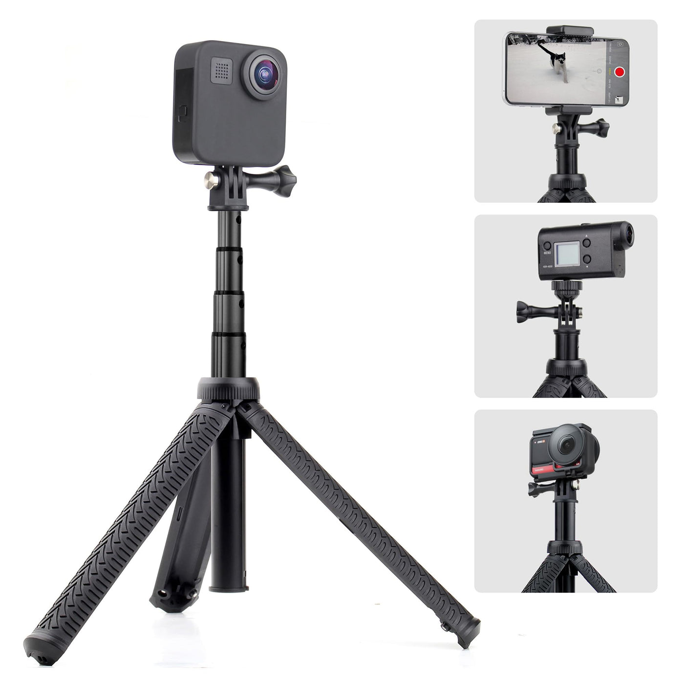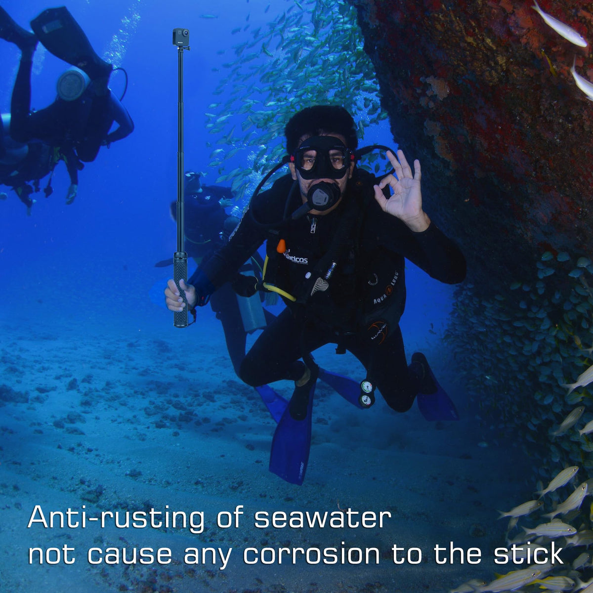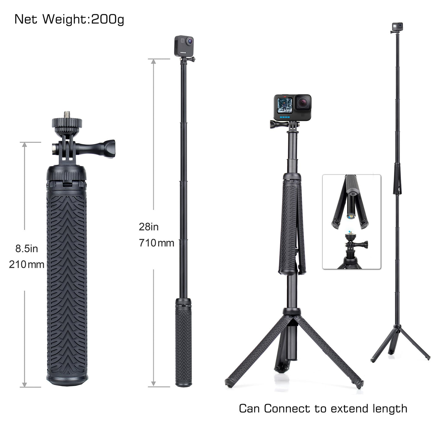 Multi-Purpose For Use: It Can Be Used As Hand Grip, Telescoping Selfie Stick And Tripod Stand For Your Action Cameras And Cell Phones. Portable For Carrying And Strong Usability In Various Conditions Such As Traveling, Surfing, Diving, Snowboarding, Vlogging. | Made Of High Quality Material: This Waterproof Selfie Stick Is Made Of High-Grade Aluminum. The Hand Grip And Bottom Are Covered With Ultra Deep Grain Designed Silicone. It Not Only Offers Premium Look, Lightweight And Strong Support, But Also Guarantees Anti-Slip Under Any Circumstances. | Wide Range Of Compatibility: It Is Not Only Compatible With Gopro Hero 13, 12, 11, 10, 9, 8, 7, 6, 5, 4, 3+,3, 2, Session, Fusion, Max, Hero (2018), Dji Osmo Action, Sjcam, Akaso, Insta360 And Other Action Cameras, But Also Compatible With All Kinds Of Cell Phones(Iphone 15 Pro Max, Iphone 15 Pro, Iphone 15) After You Install Extendable Phone Holder Clip (Included.) | Portable And Easy To Use: Weight: 7 Ozs. Length: 8.5' When Collapsed, Extended Up To 28', This Extension Pole Can Be Locked At Any Desired Length In This Range. The Pole Is Featured With Twist-Clock Design. Turn Counterclockwise To Lock. Turn Clockwise To Unlock. Open The Foldout Legs To Use As A Stable Tripod, Close Them And Hold Together By The Build-In Magnetic To Use As Hand Grip, Pull Out The Pole And Lock It To Use As Monopod. | Free Accessories Set Included: The Cell Phone Holder Clip Can Be Used To Mount All Iphone Models And Any Cell Phone Which Width Under 3.5''; The 1/4 Mount Adapter Is Used To Connect With Compact Digital Cameras And Any Devices With Standard 1/4' Socket; The Adjustable Wrist Strap Is Greatly Help To Avoid Any Dropping.