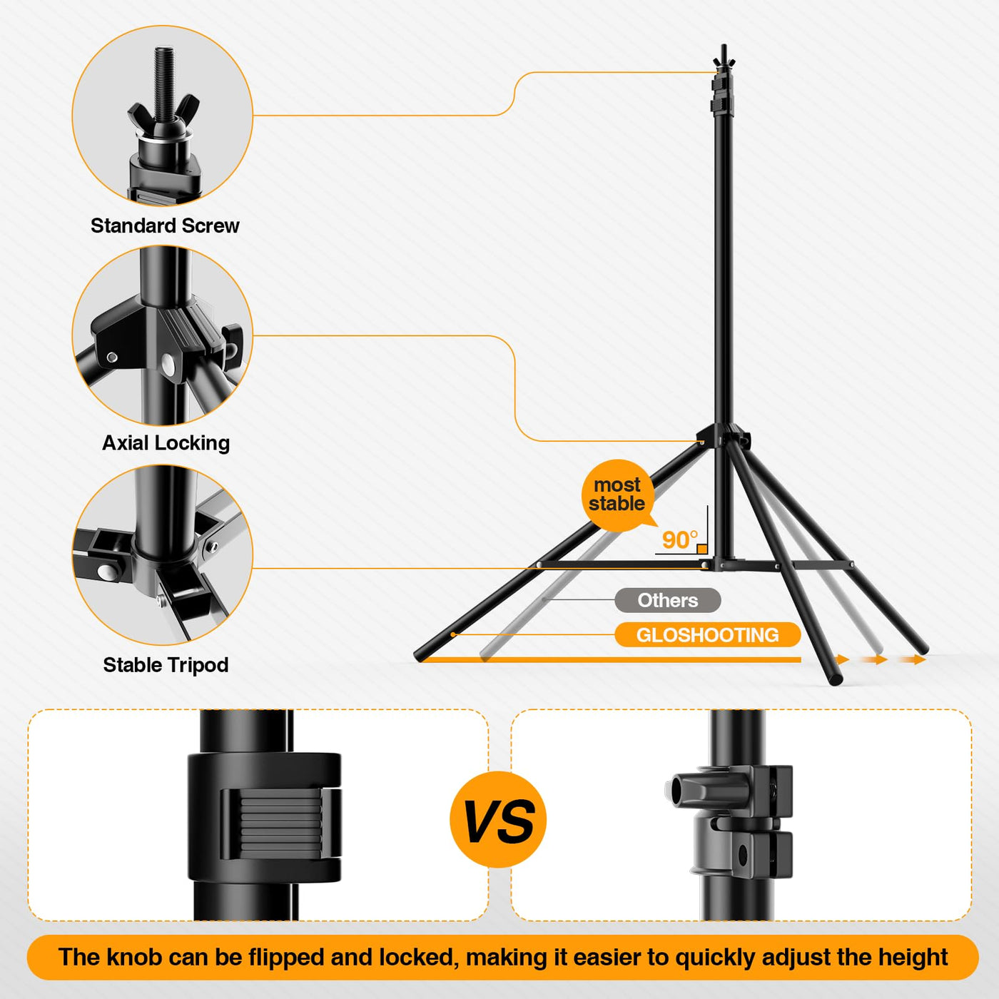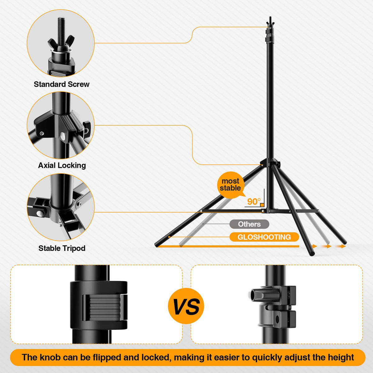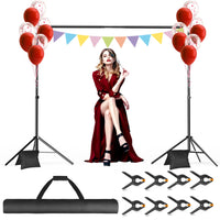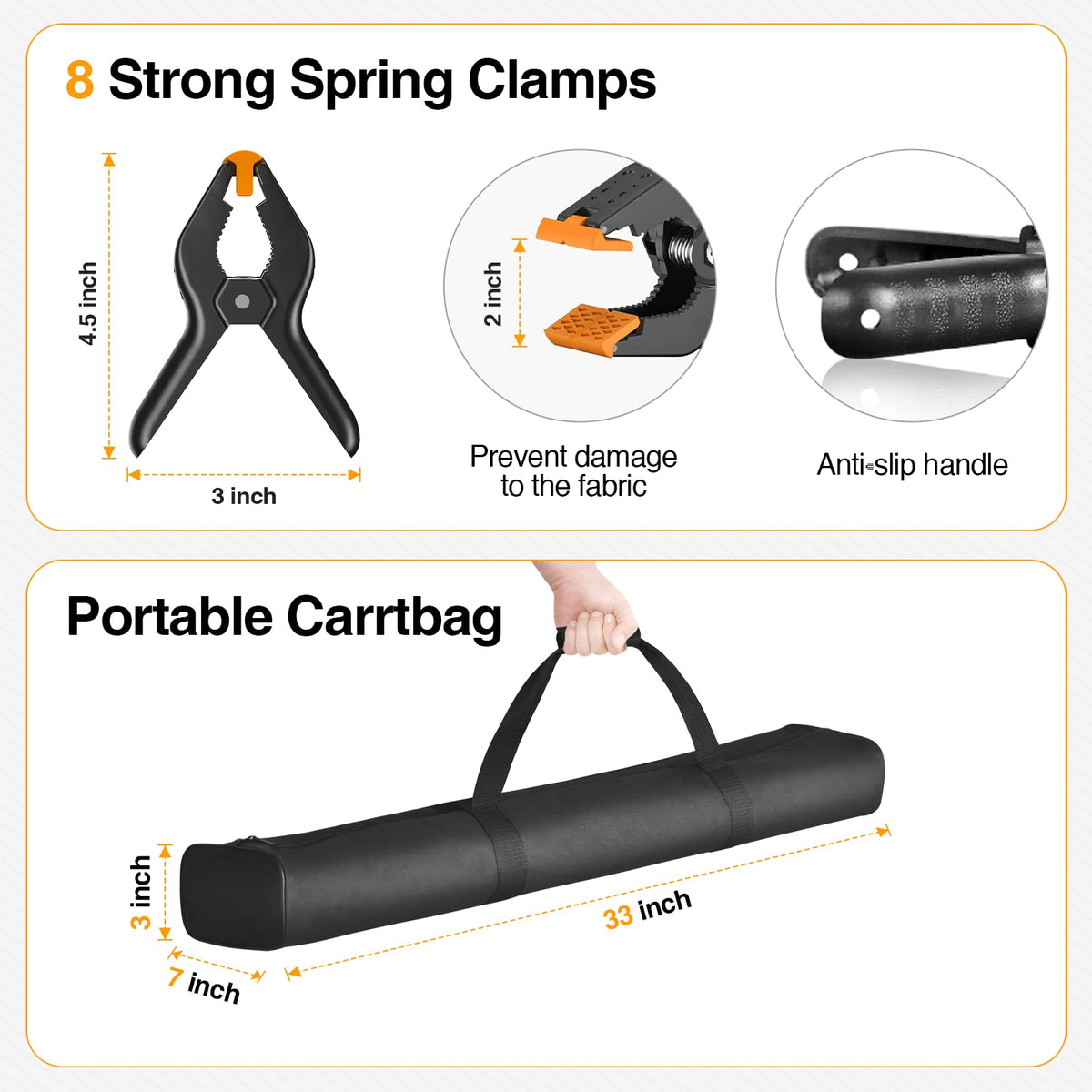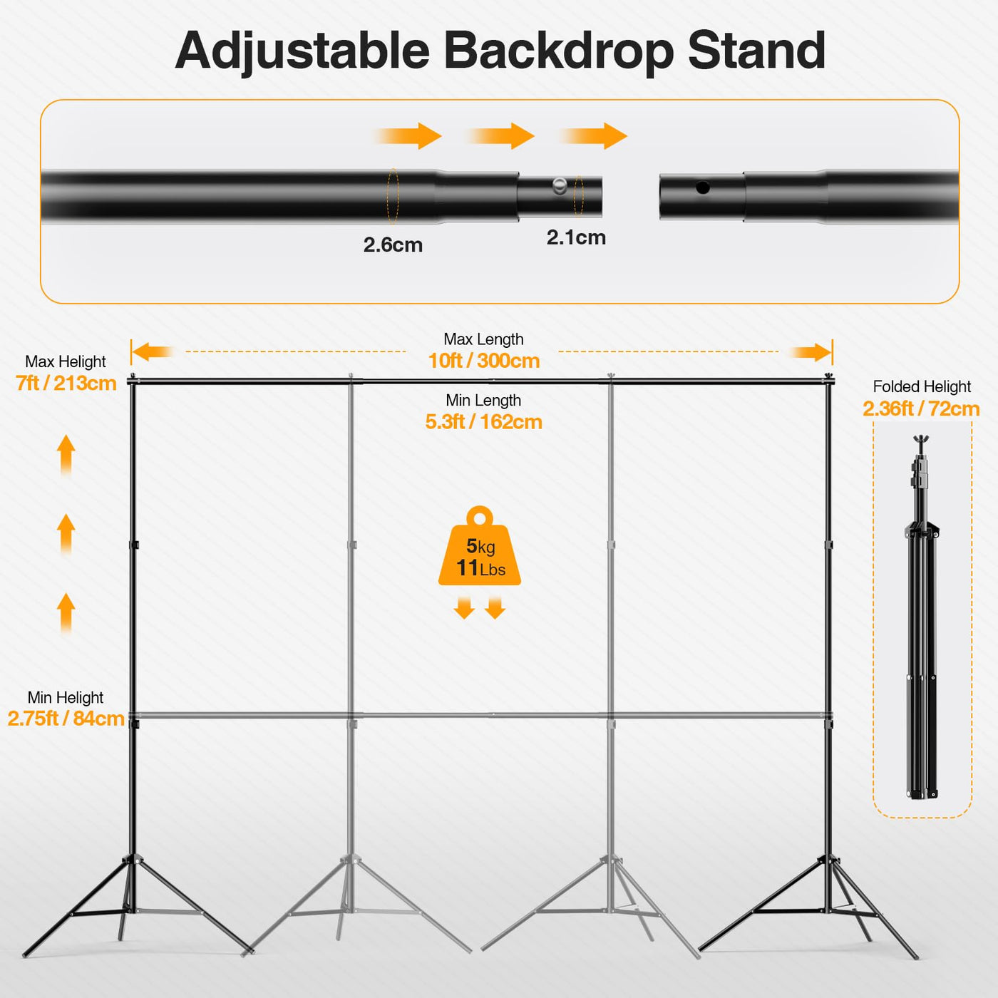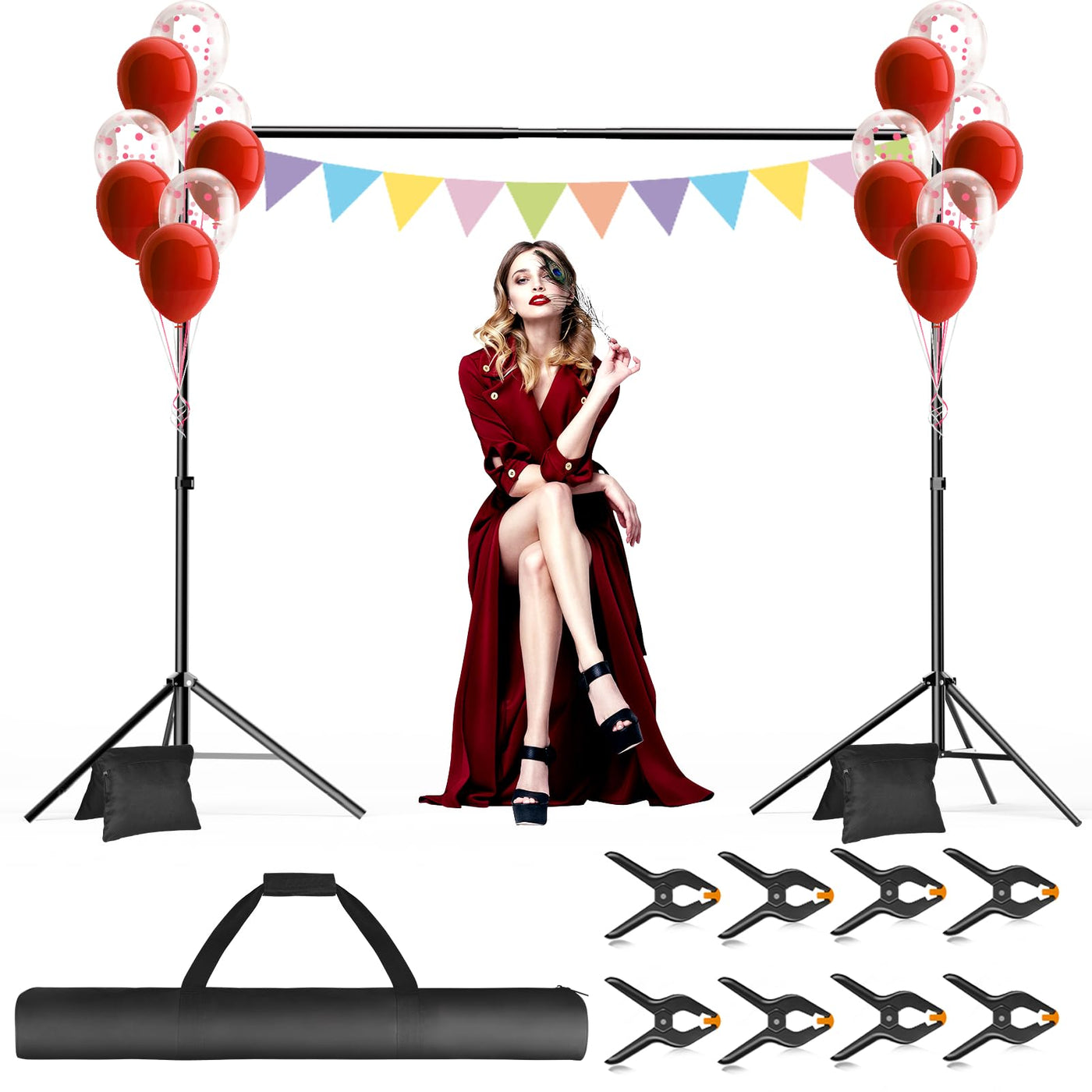 Gloshooting Photo Backdrop Stand Kit For Green Screen, Muslin, Canvas, Or Paper Backdrops, Aluminum Alloy Construction For Stablizing.The Backdrop Frame System Is An Excellent Option For Both Professional And Novice To Set Up A Photo Studio, Portable Adjustable Backdrop Stand For Easy Storage And Installation.The Backdrop Holder Has Multiple Uses And Can Be Used For Parties, Photo Studio, Wedding, Or Festivall Events.Super Easy To Assemble And Take Down, Come With The Portable Carrying Bag.Aluminum Alloy Construction, Durability & Portability. (2 X ) Backdrop Support Stand100% Aluminum Construction Max Height: 7 Ft Min Height: 2.7 Ft (2 X ) Crossbar Min Length: 5.3 Ft Max Length: 10 Ft Each Crossbar Extends To 5.3 Ft Interlock 2 Crossbars Into A Long Crossbar (8 X ) 4.5 Inch Heavy Duty Spring Clamp Hold The Muslin, Canvas, Paper, And Etc (2 X ) Sandbag Size: 9'' X 10'' Each Sandbag Rated For 20 Lbs. Premium Quality Nylon Material With Sturdy Zipper. Put Sandbags On The Base To Ensure Its Stability When Use In Outdoor With The Wind. (1X ) Portable Carry Bag Premium Quality Nylon Material.