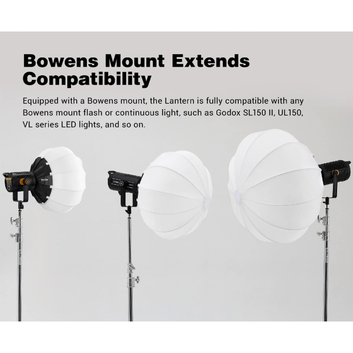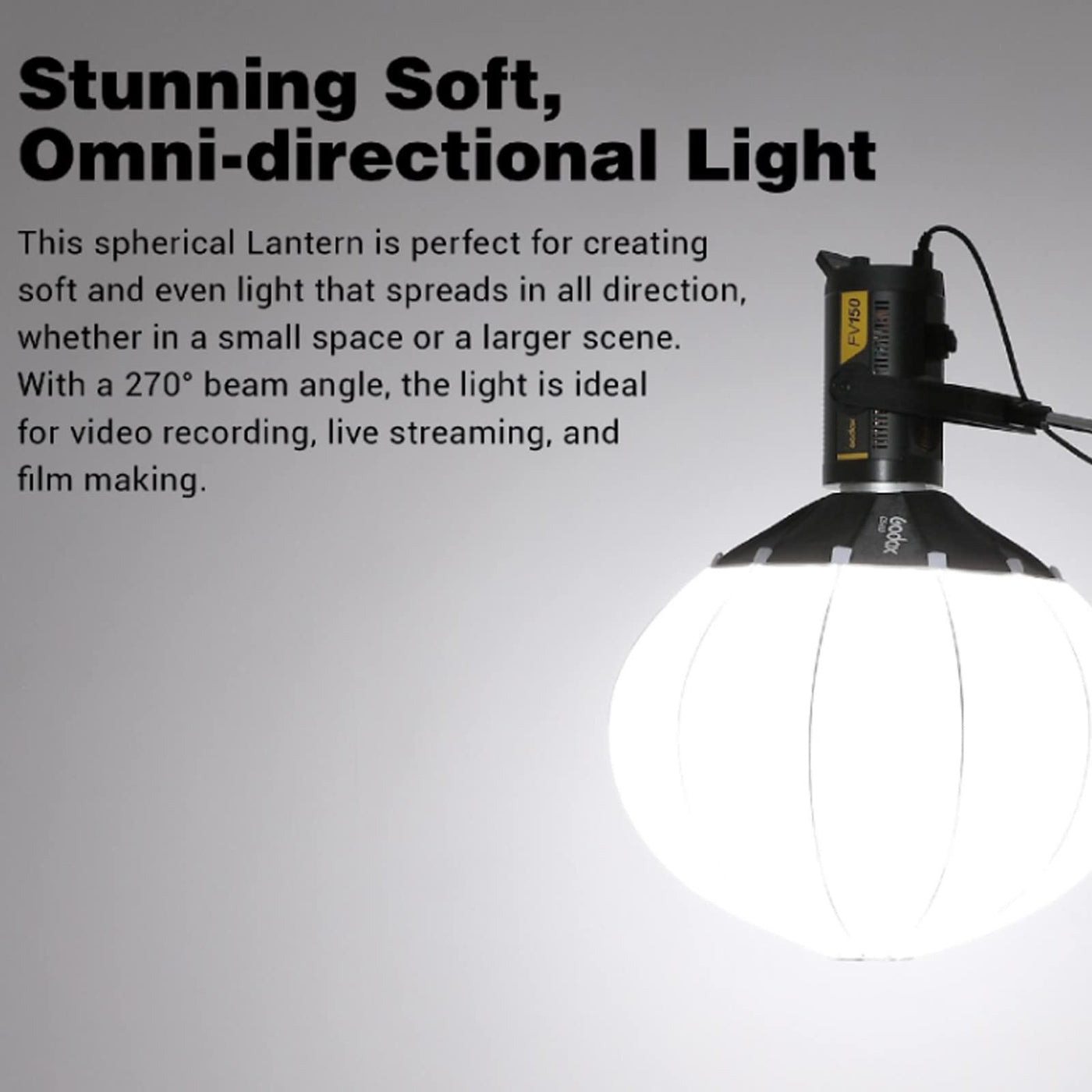 Collapsible Lantern Softboxstunning Soft, Omni-Directional Light This Spherical Lantern Is Perfect For Creating Soft And Even Light That Spreads In All Directions, Whether In A Small Space Or A Larger Scene. With A 270 Beam Angle, The Light Is Ideal For Video Recording, Live Streaming, And Filmmaking.Bowens Mount Extendscompatibility Equipped With A Bowens Mount, The Lantern Is Fully Compatible With Any Bowens Mount Flash Or Continuous Light, Such As Godox Sl150Ii, Ul150, Vl Series Led Lights, And So On.Extremely Fast Set-Up Thanks To Its Simple And Durable Design, This Softbox Is A Breeze To Use. The Lantern Could Be Popped Open Or Closed In Merely A Few Seconds, Making It A Quick Solution On The Go.A Skirt For More Control To Further Control Your Light Precisely, We Provide A Detachable 4-Section Skirt(Available For Purchase) That You Can Attach Anywhere On The Lantern. Rolling Up Or Down The Skirt, You Can Get Off Any Unwanted Bouncing Light.Package Including:1 * Godox Cs-50D Softbox1 * Cleaning Cloth
