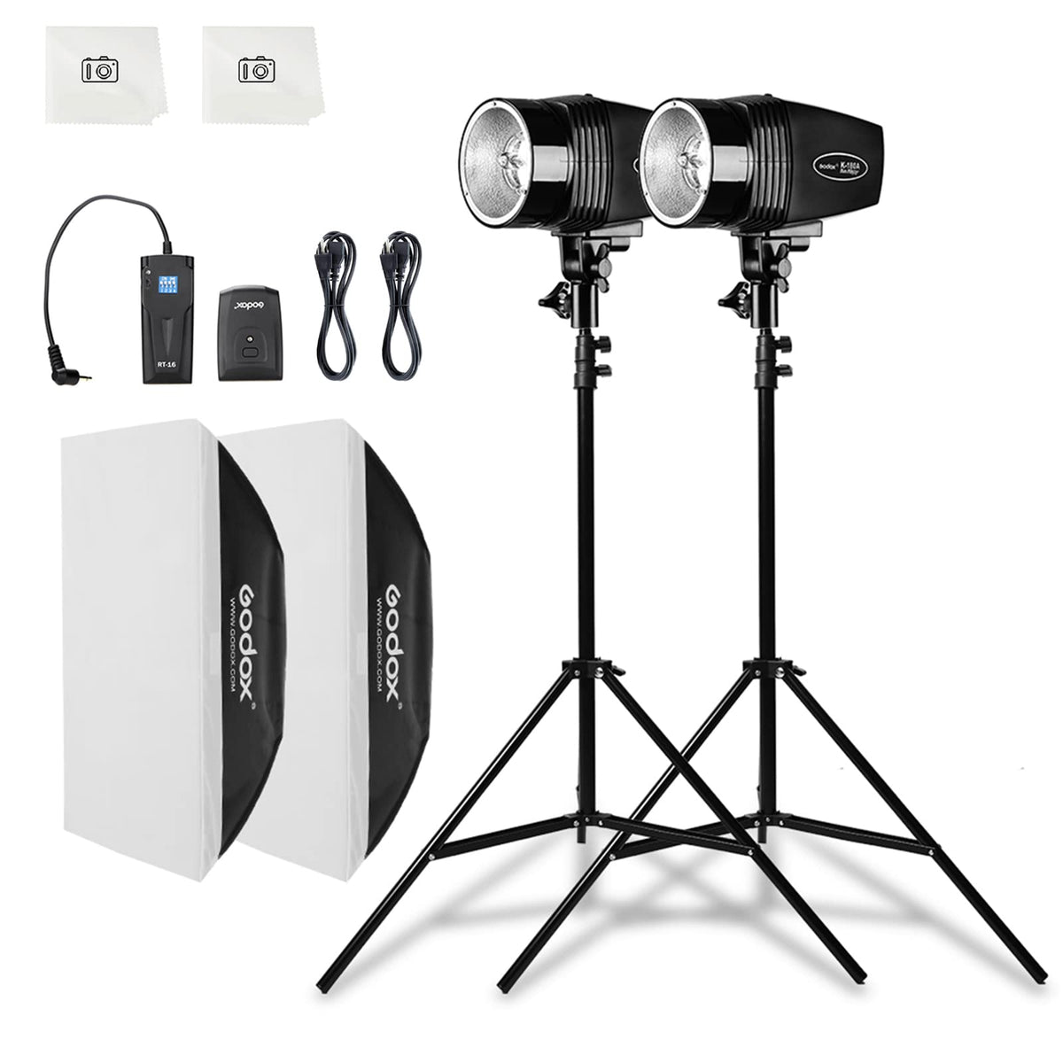 Q: What is included in the Godox Professional Studio Flash Kit?A: The Godox Professional Studio Flash Kit includes 2x 180W Monolights, 2x Softboxes, 2x Light Stands, 2x Power Cables, and 1x RT-16 Trigger set, along with an RTR-16 Trigger receiver for synchronization.