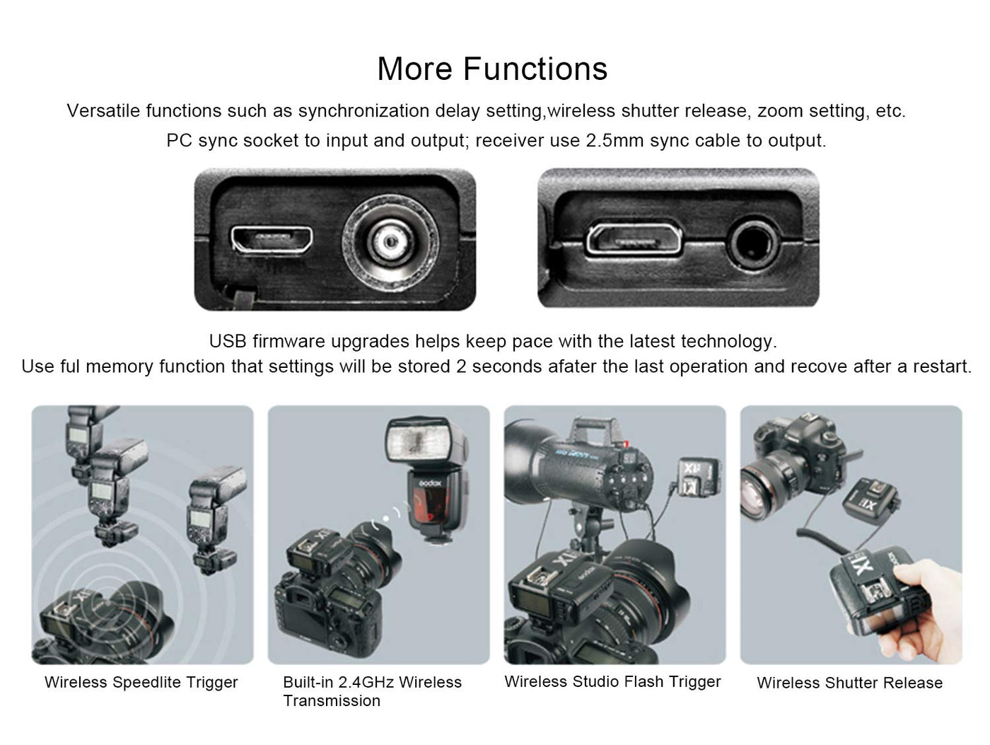 Kindly Note:1. 1/8000S Hss Function Only Availible When The Camera Support 1/8000S Shutter Speed2. Please Set Your Flash To Ttl Mode3. Set Your X1R-N Receiver And X1T-N Transmitter To The Same Group, Channel And Wireless Id, Such As The X1R-N And X1T-N All Set To Group A, Channel 15 And Wireless Id 454. When The Battery Is Lower, The X1R-N And X1T-N Will Be Turns On And Off Randomlyspecification:Model: X1R-Ncompatible With: Nikon I-Ttl Dslr Camera, Support For The Cameras With A Pc Sync Socket2.4G Wireless Transmissionmodulation Mode: Mskexposure Control: Manual Flash, Support I-Ttl Flash Autoflashdelay Setting: Yesttl Control:High Speed Sync: Yes, Up To 1/8000S Hssflash Exposure Compensation: Yes, 3 Stops In 1/3 Stops Incremetnsfocus Assist: Manual Openmulti Flash: Yessecound Curtain Sync: Yesmodeling Flash: Yes, Fired With Camera'S Depth-Of-Field Preview Buttonwireless Function: Compatible For Nikon Cls(Creating Lighting System)Controllable Slave Group: Max. 6 Groups (M/A/B/C/D/E)Transmission Range(Approx.): >100 Meterschannel: 32 Channelsothers:Zoom Setting: The Focal Length Can Be Adjusted Through The Transmitterdisplay Panel: Wide Lcd Panel, Backlight On/Offoutput Interface: Use A 2.5Mm Sync Cord To Outputmemory Function: Settings Will Be Stored 2 Secounds After Last Operation And Recover After A Restartdimension: 70X65X47Mmweight: 70Gpackage Included:1 X Godox X1R-N Receiver1 X Remote Cable(N1)1 X Remote Cable(N3)1 X Sync Cable1 X Sync Adapter1 X Ceari Clean Cloth