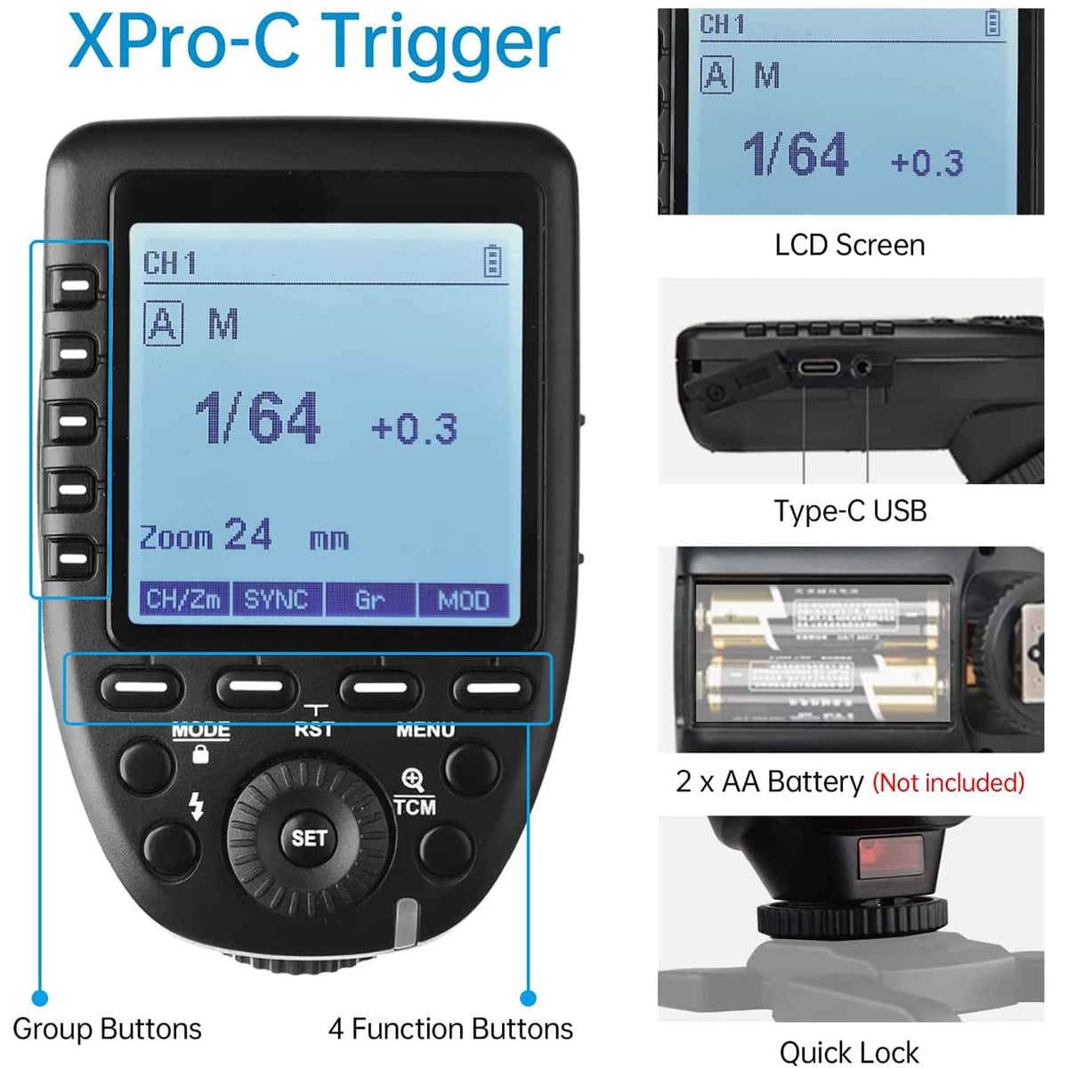 Godox Xpro C Wireless Flash Trigger For Canon E Ttl Camera 2.4G Wireless X System Hss 1/8000S, Lcd Screen Design 5 Dedicated Gro