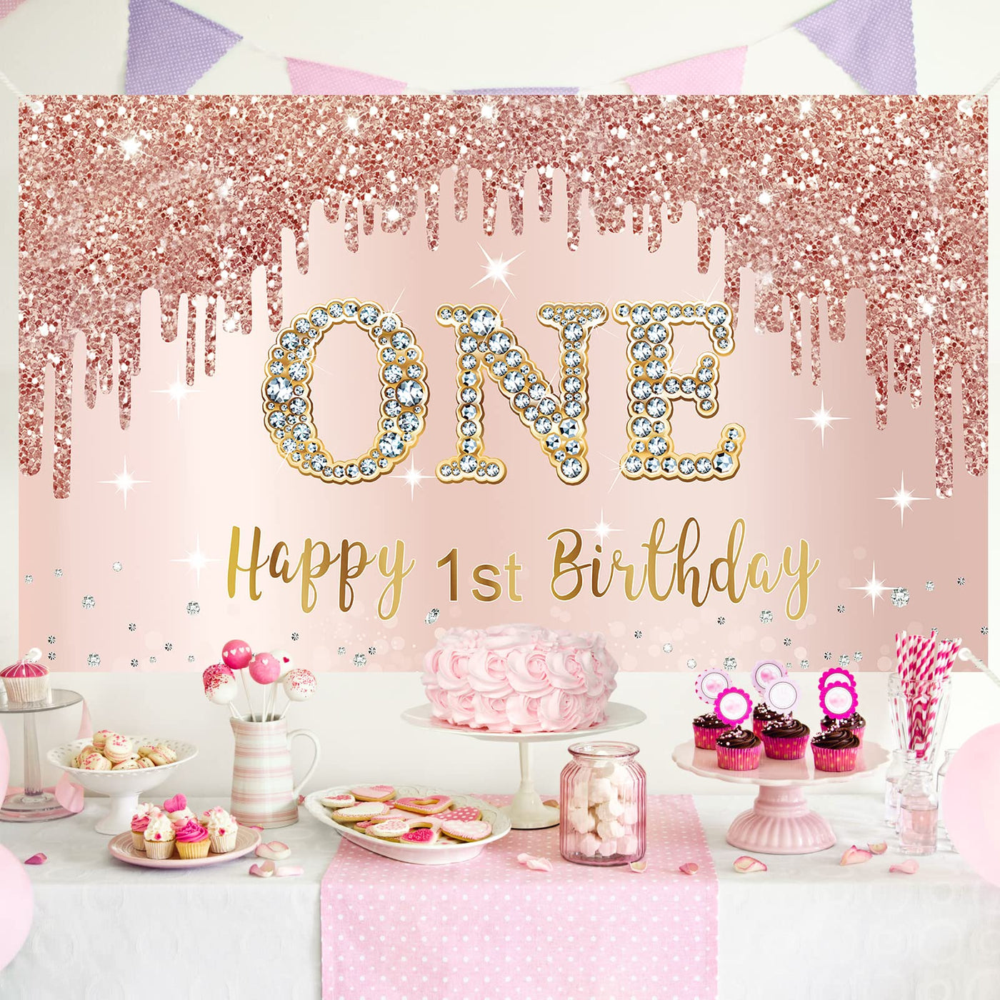 Happy 1St Birthday Banner Backdrop Decorations For Girls, Rose Gold 1 Year Old Birthday Party Sign Supplies, Pink One Birthday P