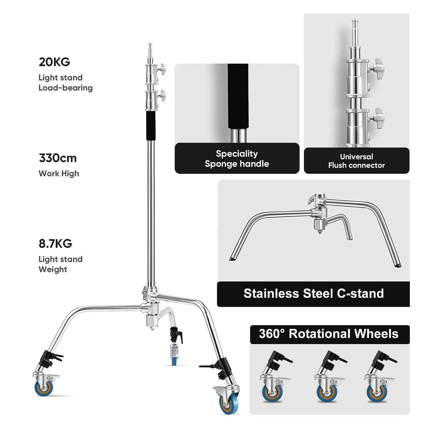 Soonpho Heavy Duty C Stand 11.3ft with Boom Arm & Wheels - Sturdy Stainless Steel Light Stand for Photography, Reflectors, Softboxes