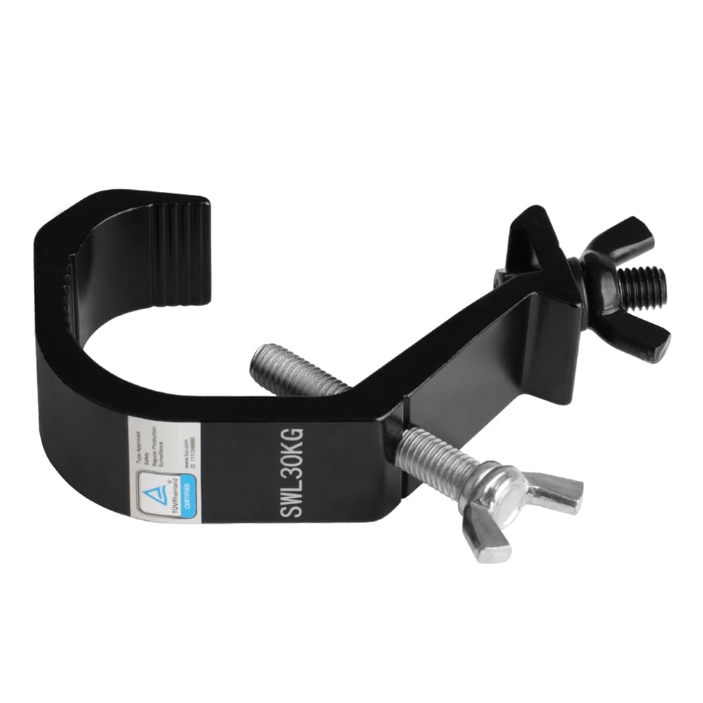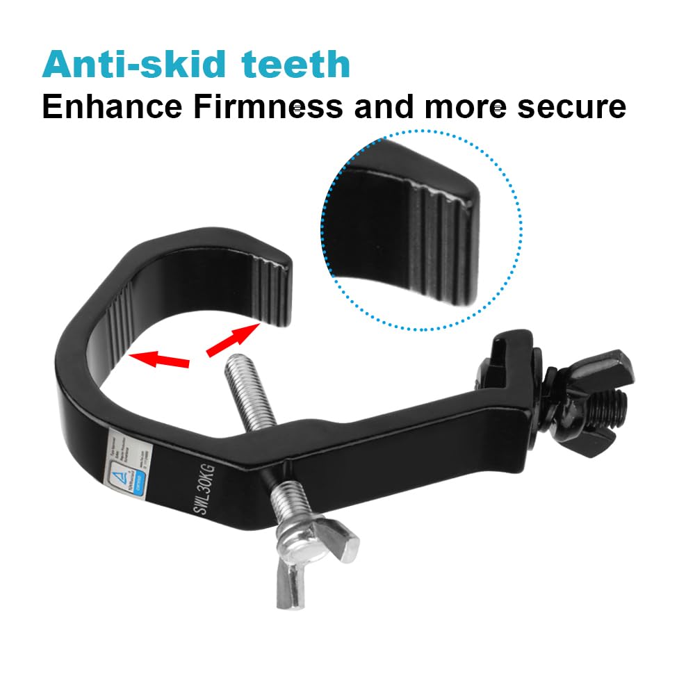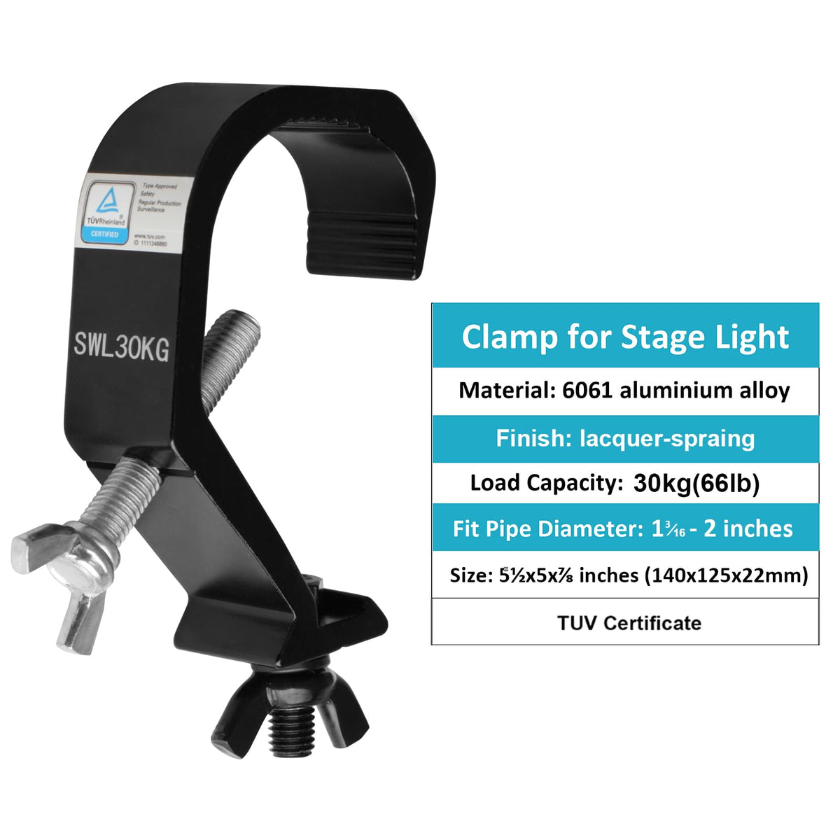 Specification: Aluminum Alloy 6061+Surface Black Coated Fit Pipe Od: 1.18 ''-2 ''/30-51Mm, Fits Truss F24 F34 Clamp Width: 7/8 ''/22Mm Threaded Bolt: 3/8 ''/10Mm Max Load Capacity: 66 Lb / 30Kg Clamp Size: 5-1/2 '' X 5 '' X 7/8 ''(14 X 12.5 X 2.2Cm) Weight: 0.4 Lb-1 Pc, 2.23 Lb-1 Pack Package Size: 16 X12 X 11Cm Package Content: 5 X Lighting Truss Clamps