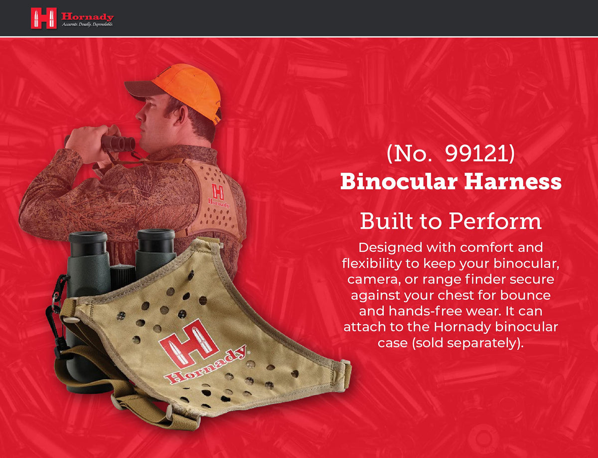 Hornady Binocular Harness Designed For Comfort And Flexibility, This Harness Distributes The Weight Of Your Binoculars Over The Four Elastic Straps And Form-Fitting X Panel, Alleviating Neck Pain. Easy To Put On And Take Off, The X Panel On The Back Features An Imprinted Hornady Logo. No. 99121