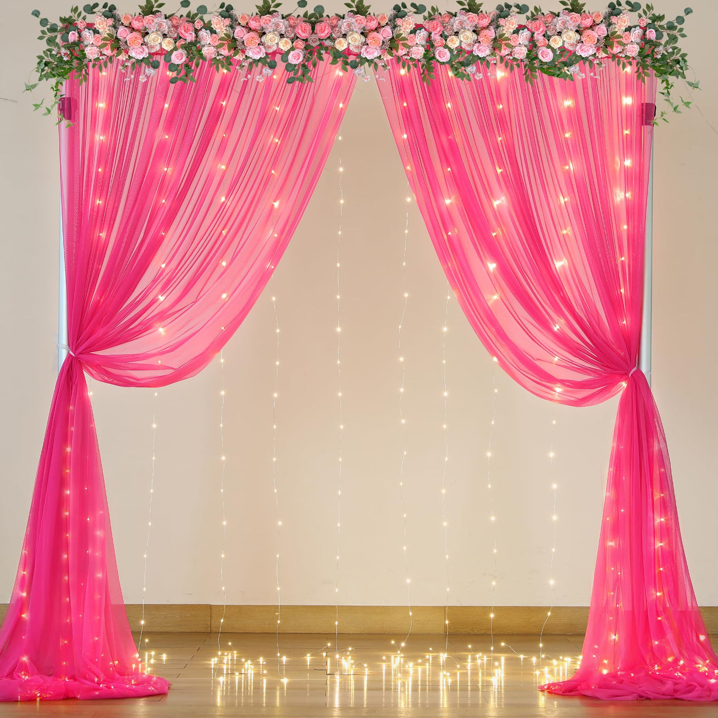 Hot Pink Tulle Backdrop Curtain With Lights For Parties 10X8Ft Fuchsia Sheer Backdrop Curtains For Weddings Birthday Baby Shower