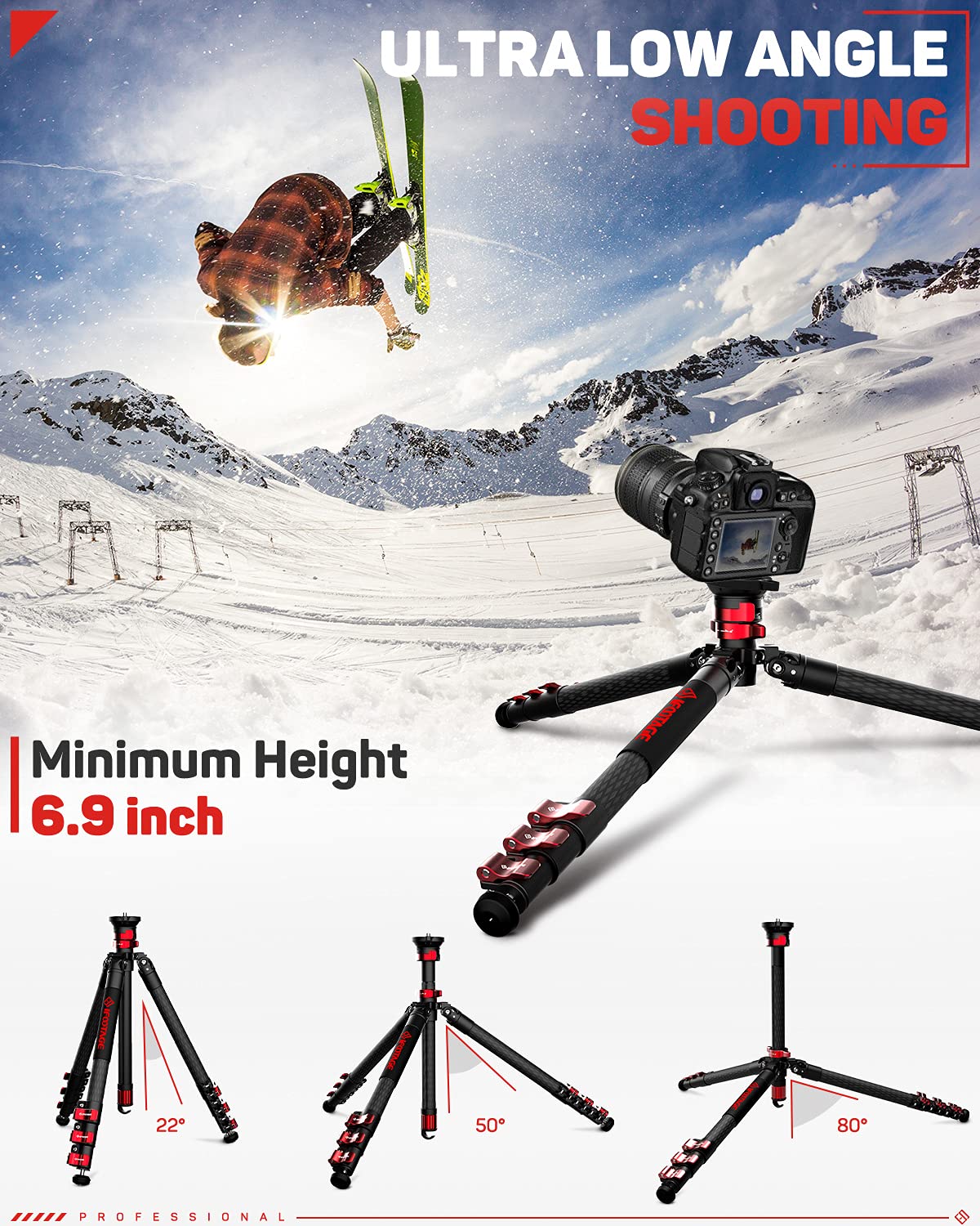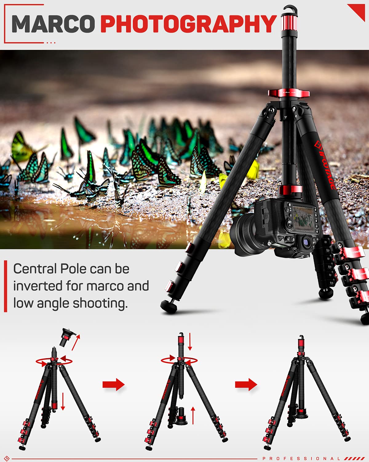 Features: 1)Integrated Design With Ball Head And Centre Column Allows For Quick And Easy Set Up. 2)Removable Centre Column Allows Low Angle Recording. 3)Simple To Use, Robust Buckle Leg Locking System. 4)A Combination Of High Quality, Superior Grade Carbon Fiber And Aluminium Magnesium Alloy Materials Provide Increased Strength, Rigidity And Durability. 5)Gazelle Ta5/Tc5/Ta6/Tc6 Are Lightweight And Portable Tripods Which Can Be Carried On A Backpack. Parameters: Model: Tc5 Weight: 4.3 Lbs Section: 4 Maximum Height: 59 Inch Minimum Height: 6.9 Inch Maximum Load: 13.2 Lbs Folded Height: 20.6 Inch Leg Adjustment Angles: 22,50,80 Leg Diameter: 1.2 Inch Material: Carbon Fiber Package Contents: 1* Tripod 1* Leg Adjustment Tool 1* Carrying Bag 1* User Manual