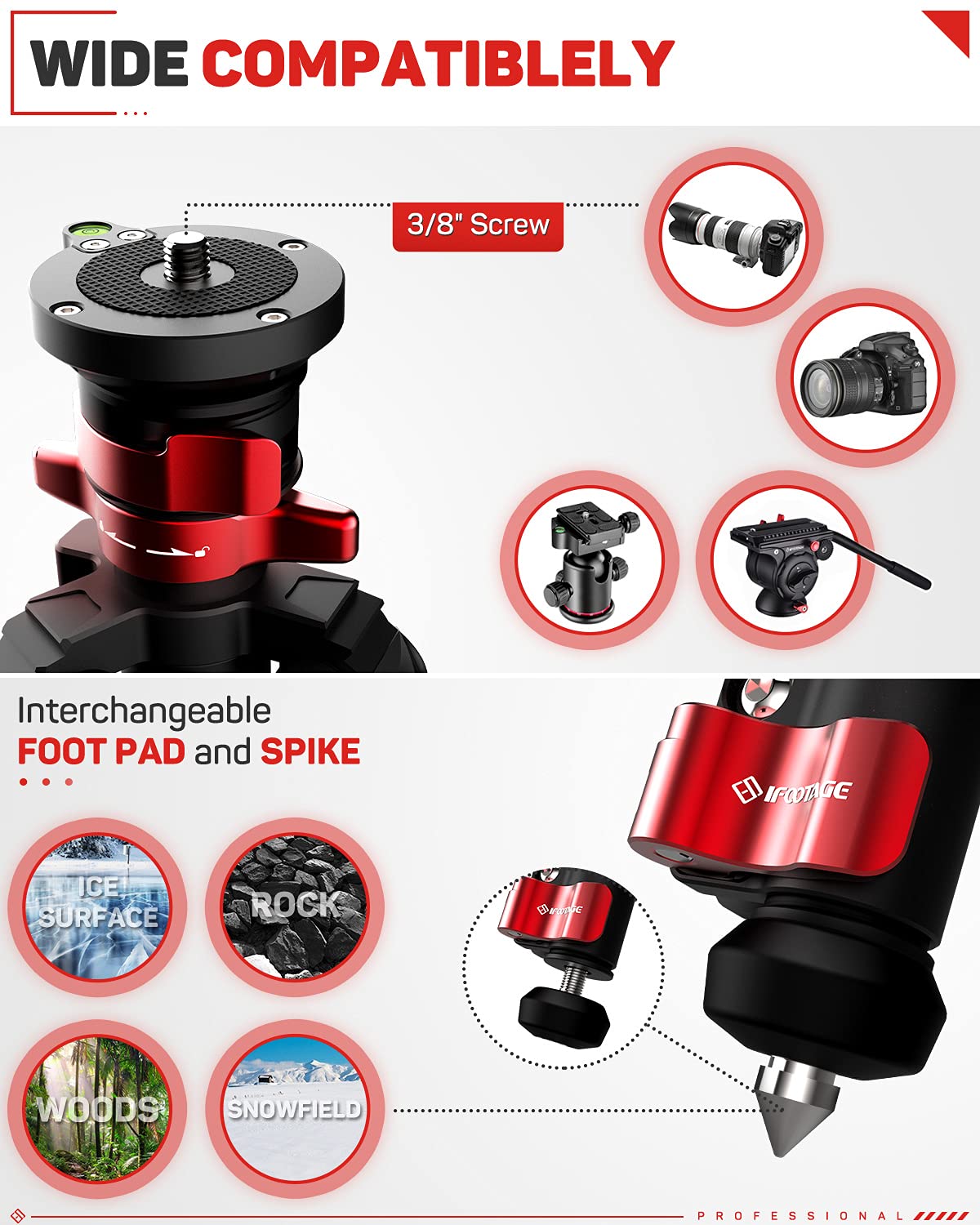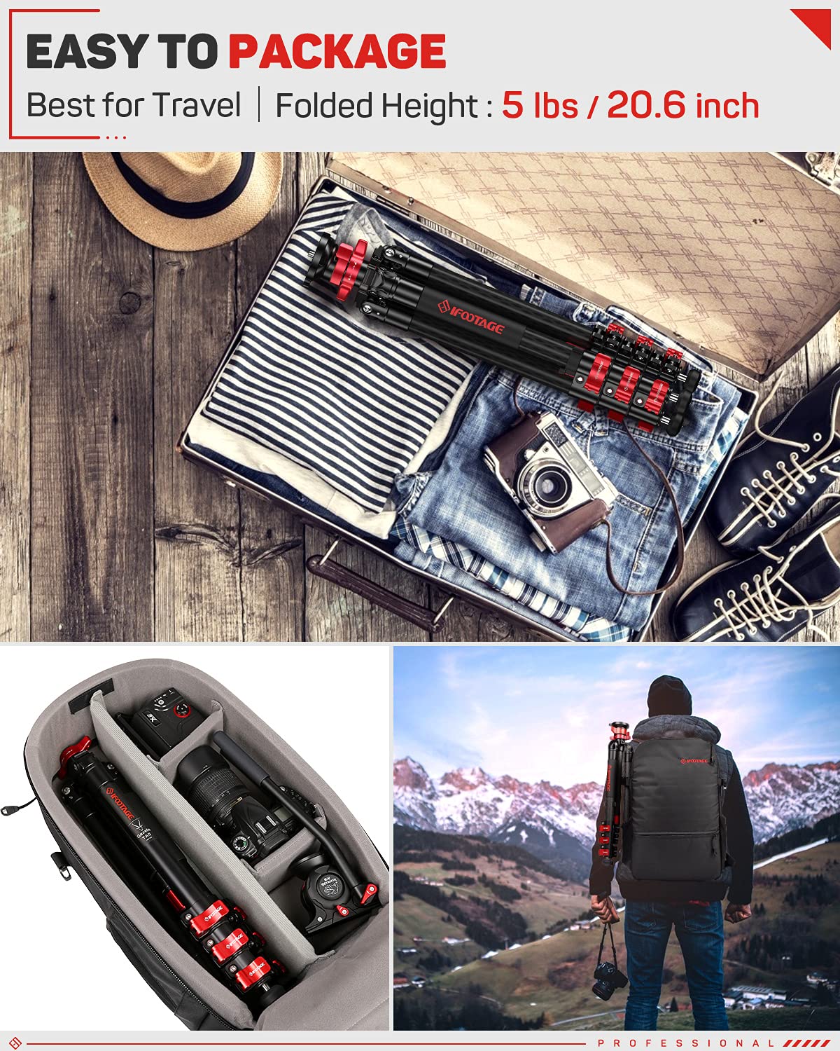 Ifootage Carbon Fiber Travel Tripod, 59'' Professional Video Camera Tripods 4 Sections With Centre Pole,Compatible With Canon, N