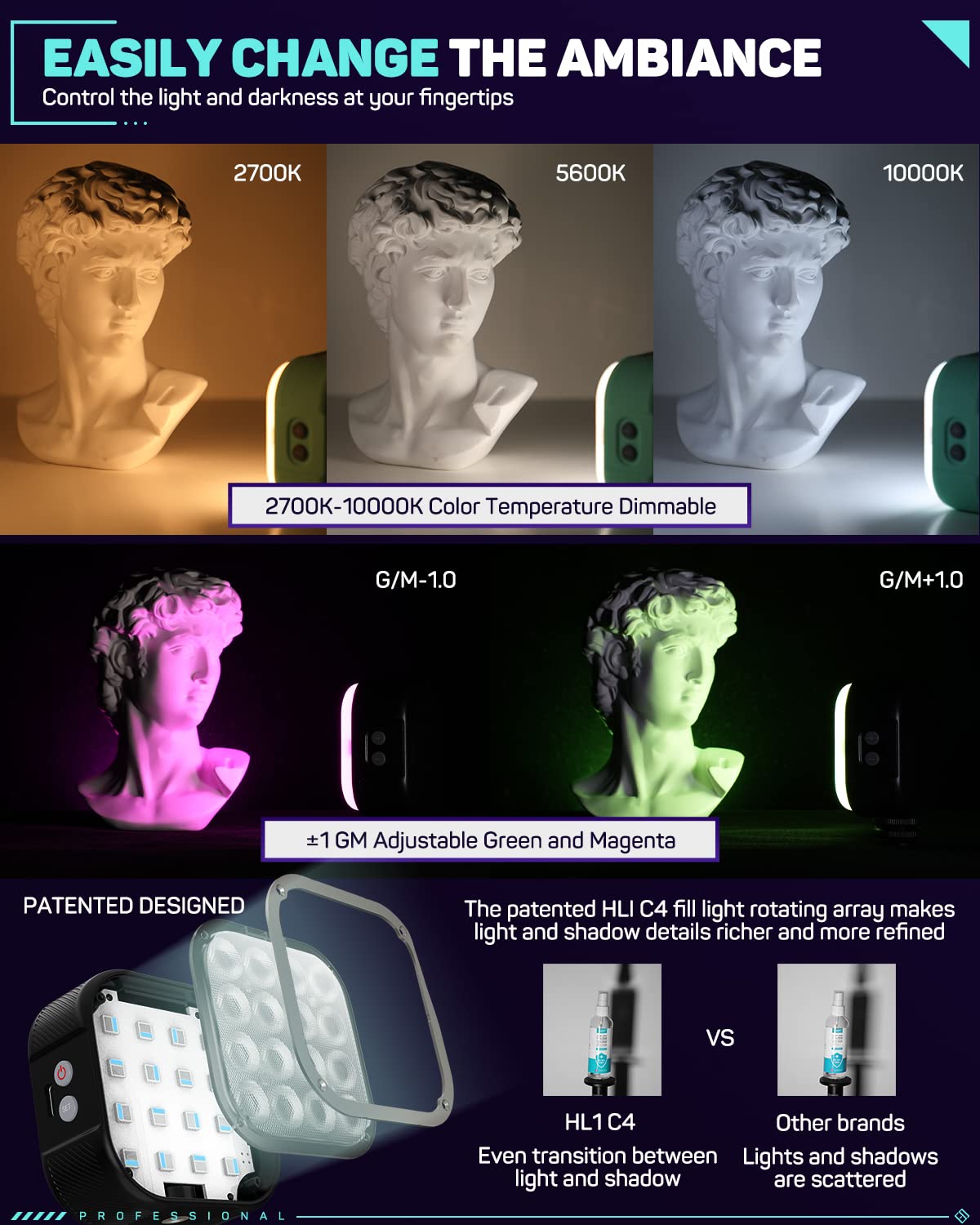Q: What makes the IFOOTAGE HL1 C4 different from other on-camera lights?A: The HL1 C4 stands out due to its extensive color options, unique lighting effects, magnetic attraction feature for easy setup, and advanced keyframe controls for precise lighting adjustments, making it versatile for various filming scenarios.
