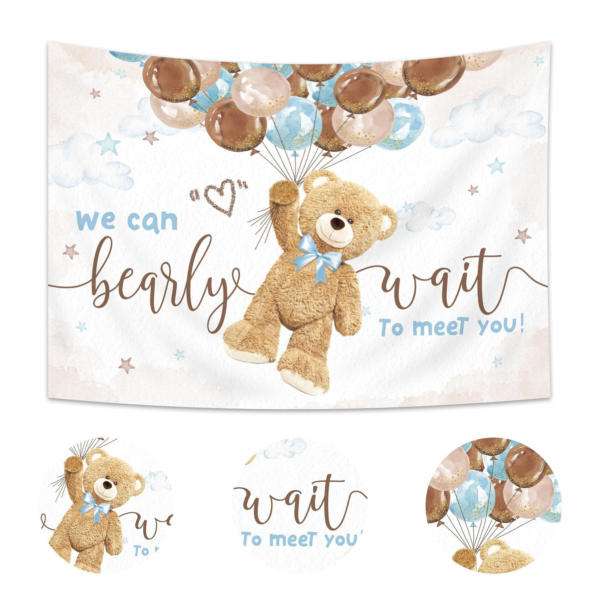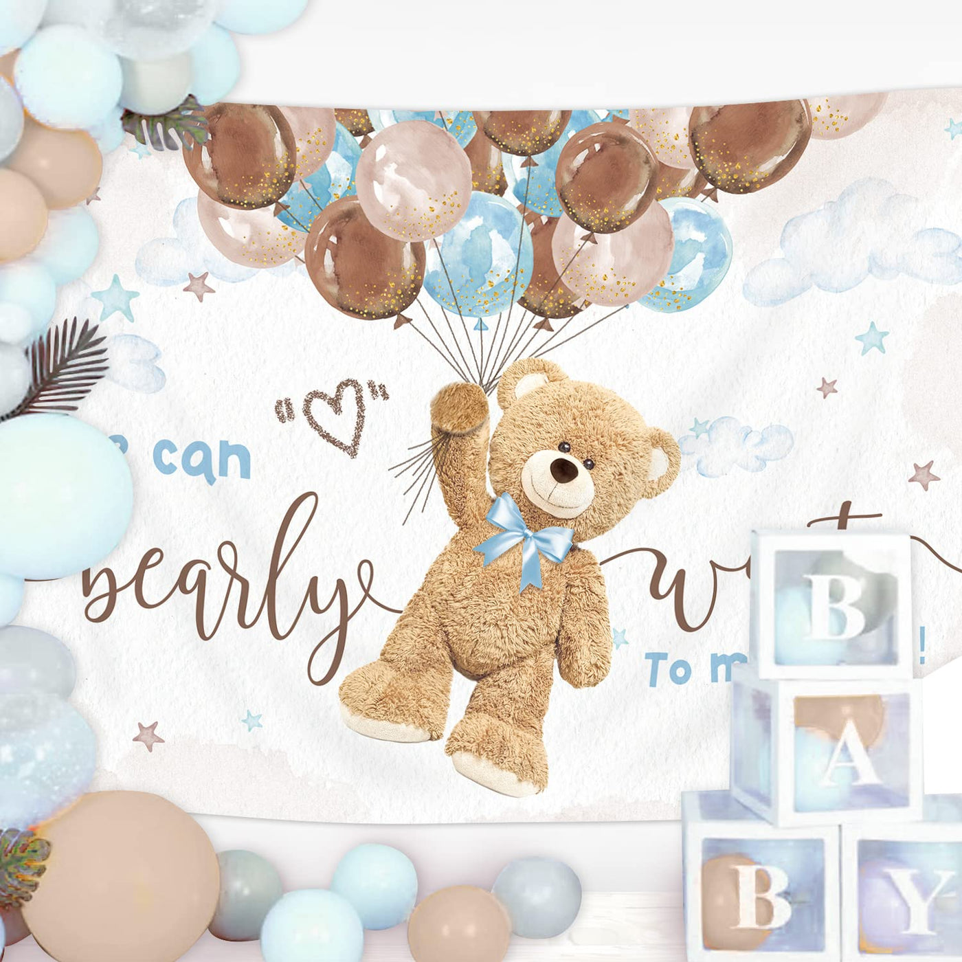 Imirell Bear Baby Shower Backdrop 7Wx5H Feet Boys We Can Bearly Wait To Meet You Cute Cartoon Lovely Balloons Polyester Fabric K