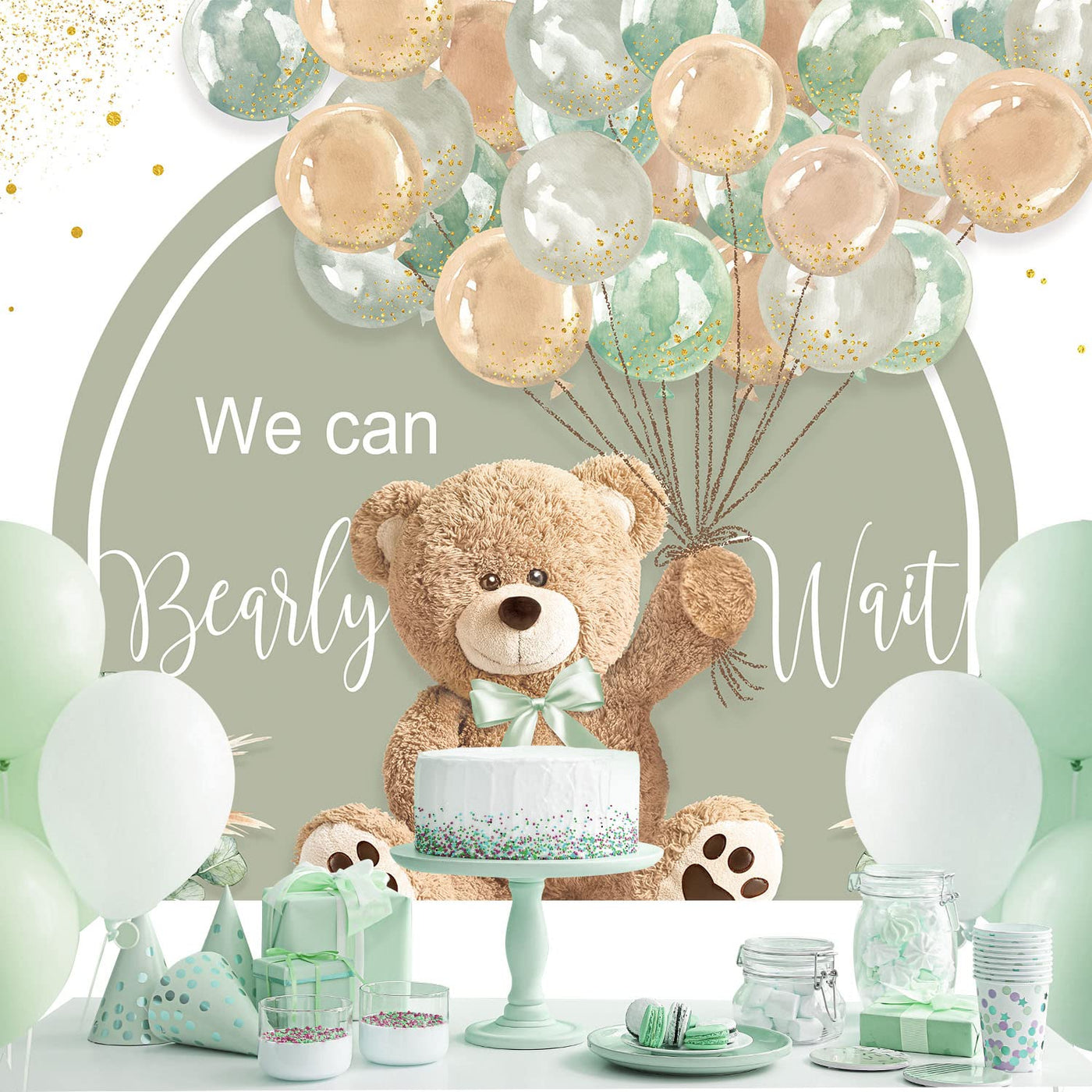 Imirell Bear Baby Shower Backdrop 8Wx6H Feet We Can Bearly Wait Cute Cartoon Green Brown Balloon Floral Pampas Grass Polyester F